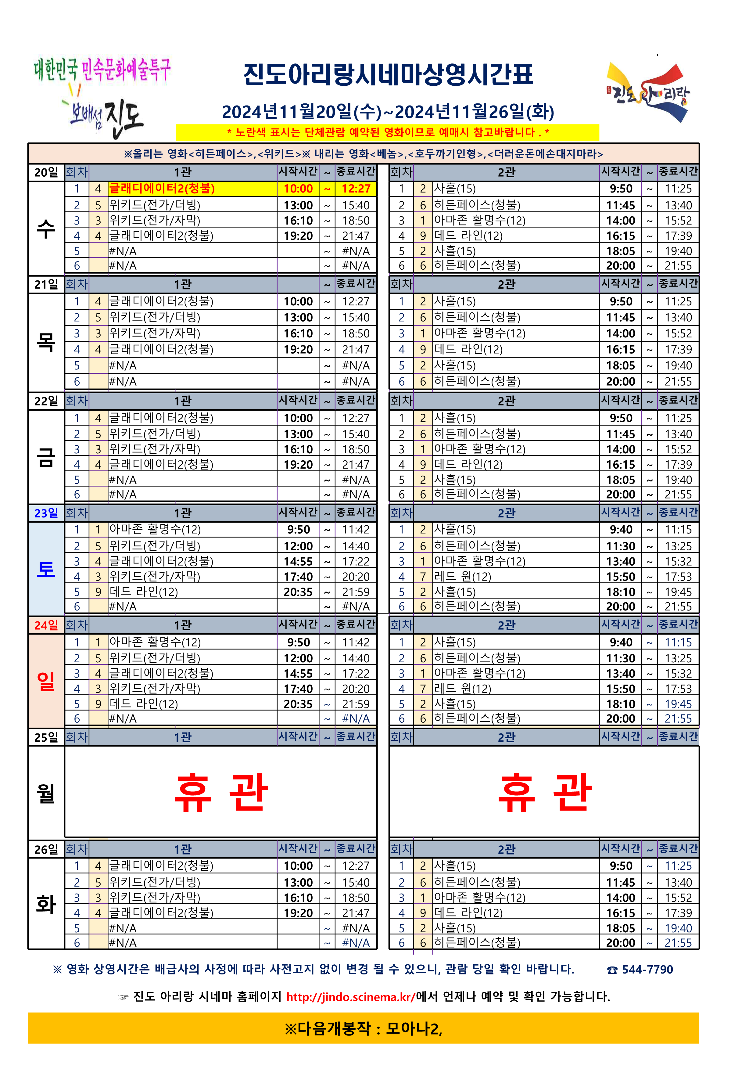 진도아리랑시네마 상영시간표 <2024.11.20(수)~11.26(화)> 안내드립니다.