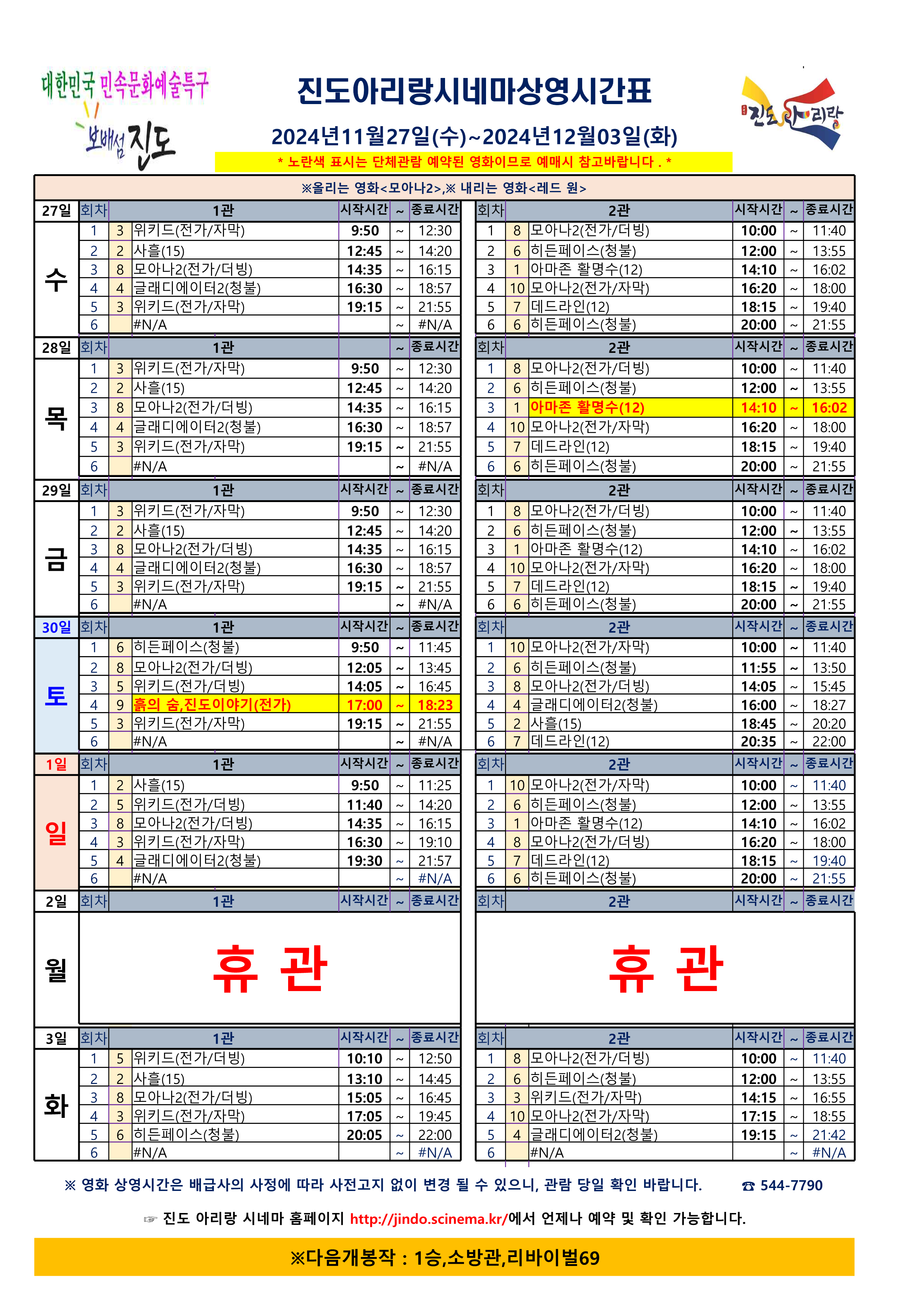 진도아리랑시네마 상영스케줄<2024.11.27(수)~12.03(화) >안내드립니다.