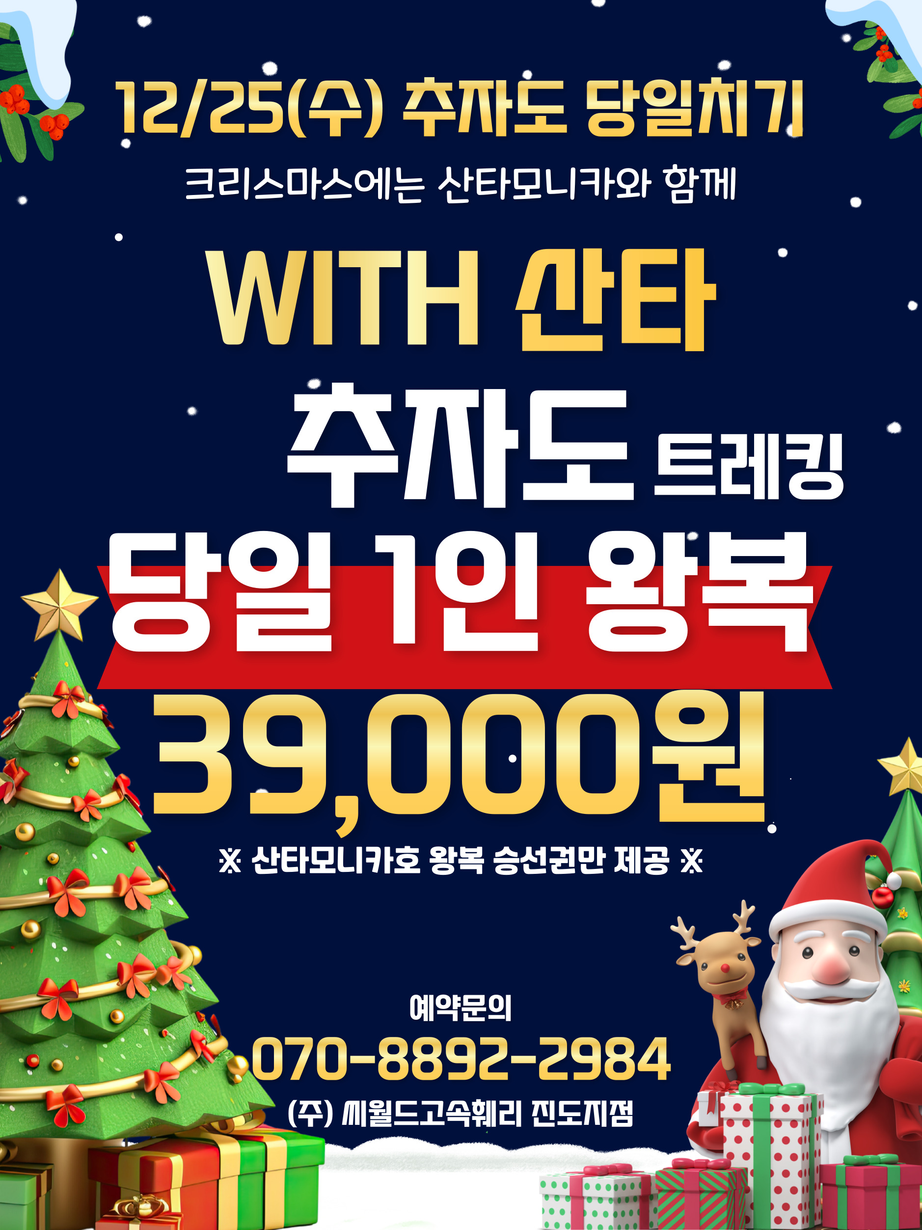 12월 25일 수요일 크리스마스 ! 나 홀로 크리스마스 쓸쓸한 크리스마스 NONO ~ 진도에서 추자까지 단 45분 ~ 특가받고 추자가자 !! 왕복 39,000원에 진행되는 특가 ! 예약문의는 씨월드고속훼리로 ~