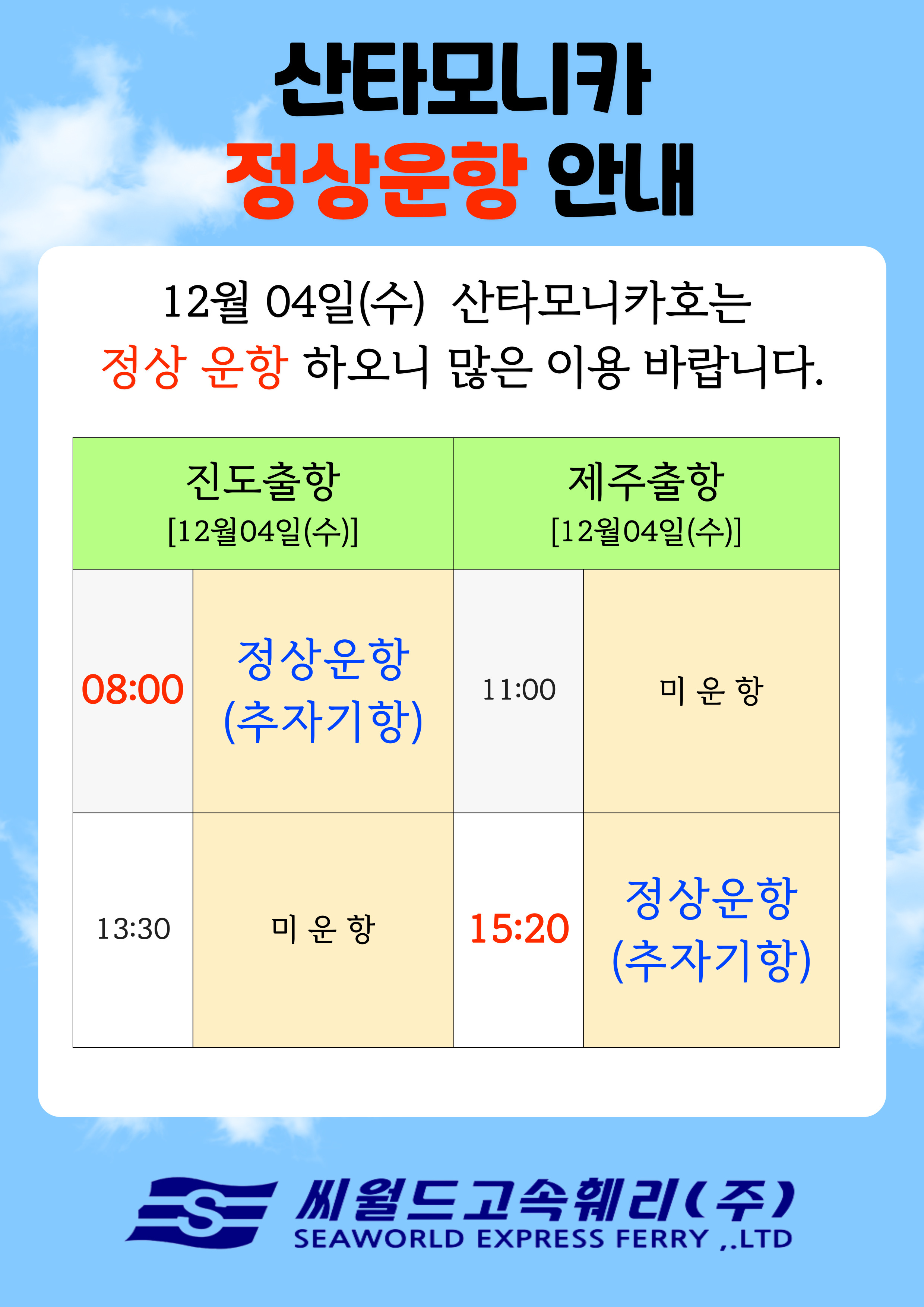 진도 <-> 제주간을 운항하는 산타모니카호는 12/04 (수) 휴항일이었으나 고객의 편의를 위하여 임시운항 하오니 많은 이용 바랍니다. 항상 최선을 다하는 씨월드고속훼리가 되겠습니다. 감사합니다.