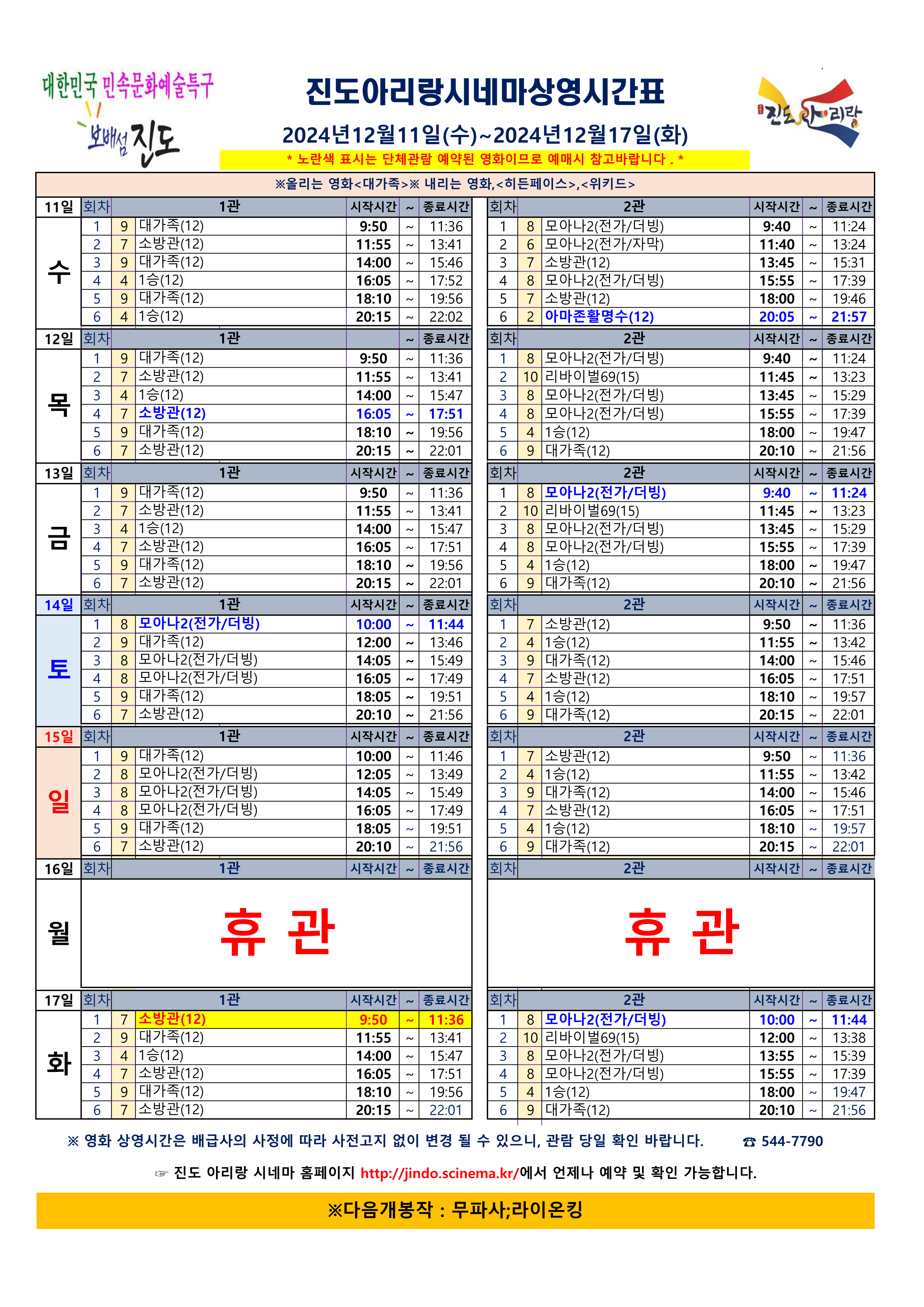 진도아리랑시네마 상영스케줄 <(2024.12.11(수)~12.17(화) >안내드립니다.