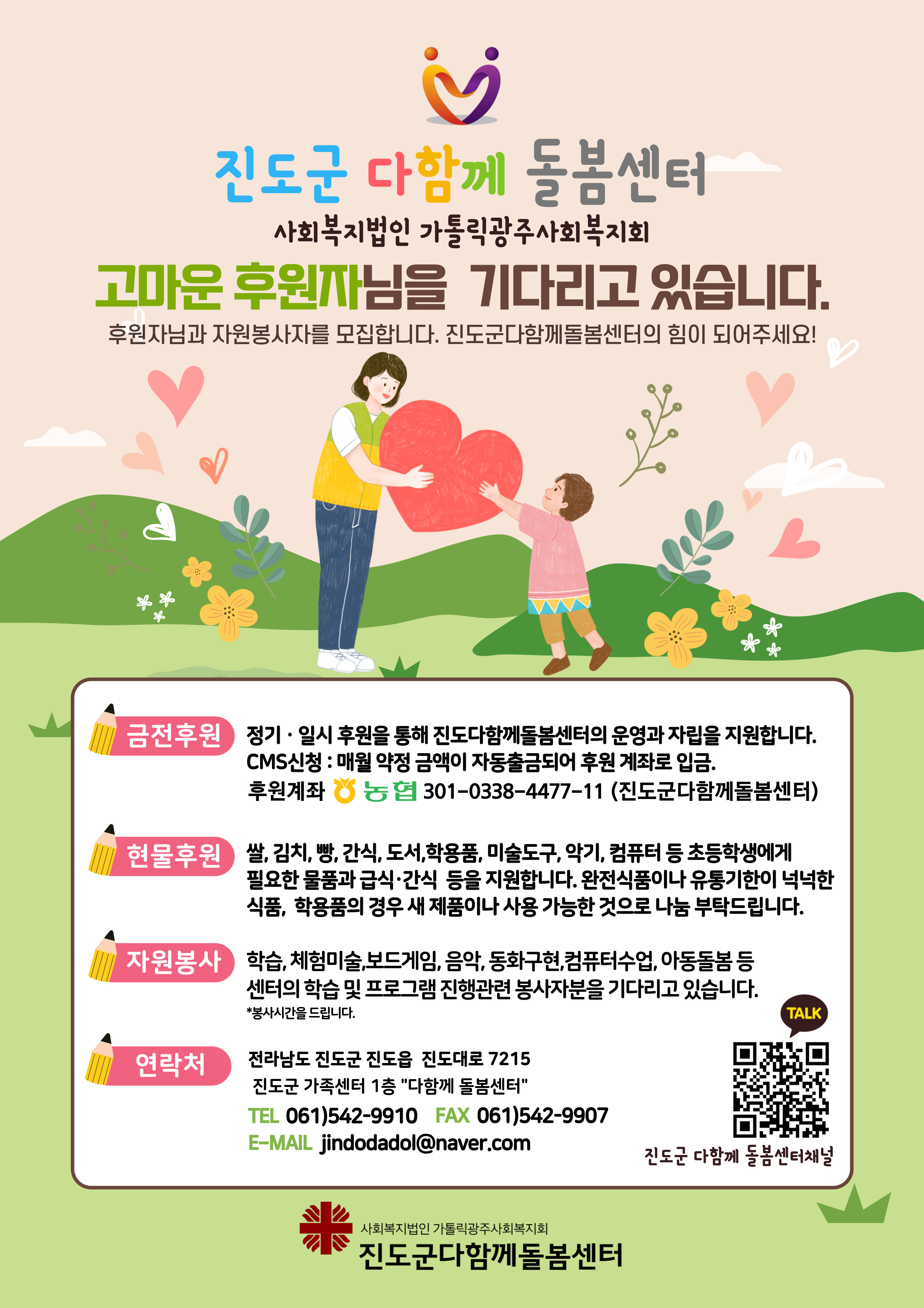 진도군다함께돌봄센터 ♥방학기간 자원봉사자님♥을 기다리고 있습니다. 1월 13일 부터 2월 28일 까지 자원봉사자님을 기다리고 있습니다. 봉사시간을 드립니다. 1365자원봉사포털 가입 후 → 통함검색창에 "진도군다함께" 라고 치고 원하는 날짜를 등록해 주시면 됩니다.