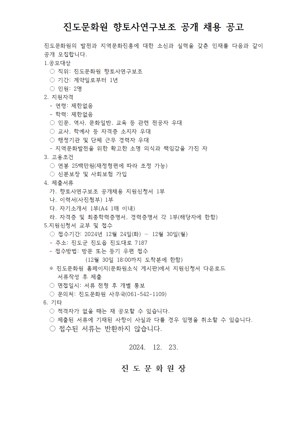 2025 진도문화원 향토사연구보조 공개 채용 공고