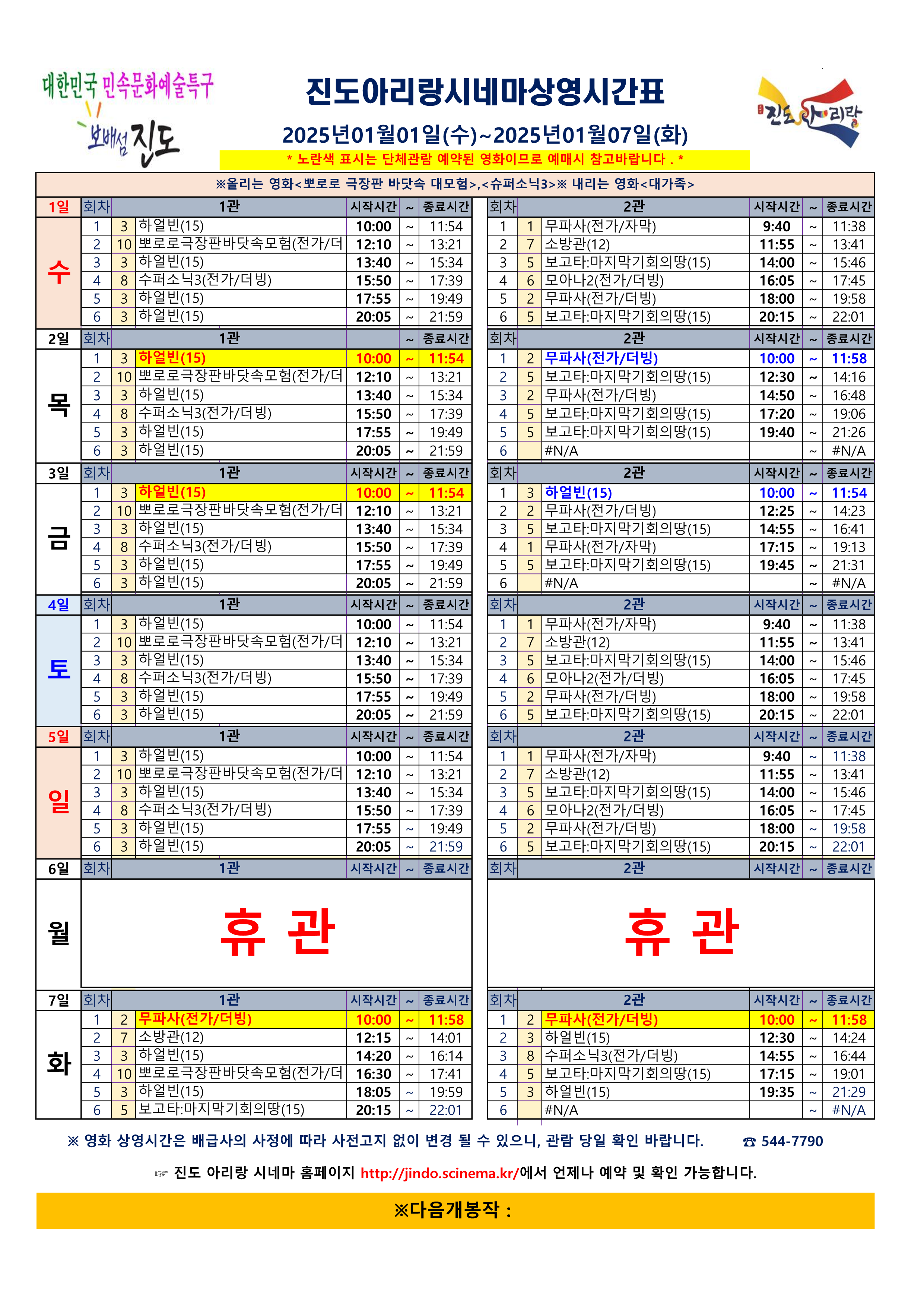 진도아리랑시네마 상영시간표 <2025.01.01(수)~01.07(화)> 안내드립니다.