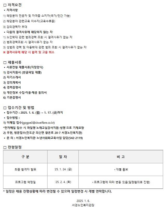 2025년 서경노인복지관 노년사회화교육 프로그램 강사모집