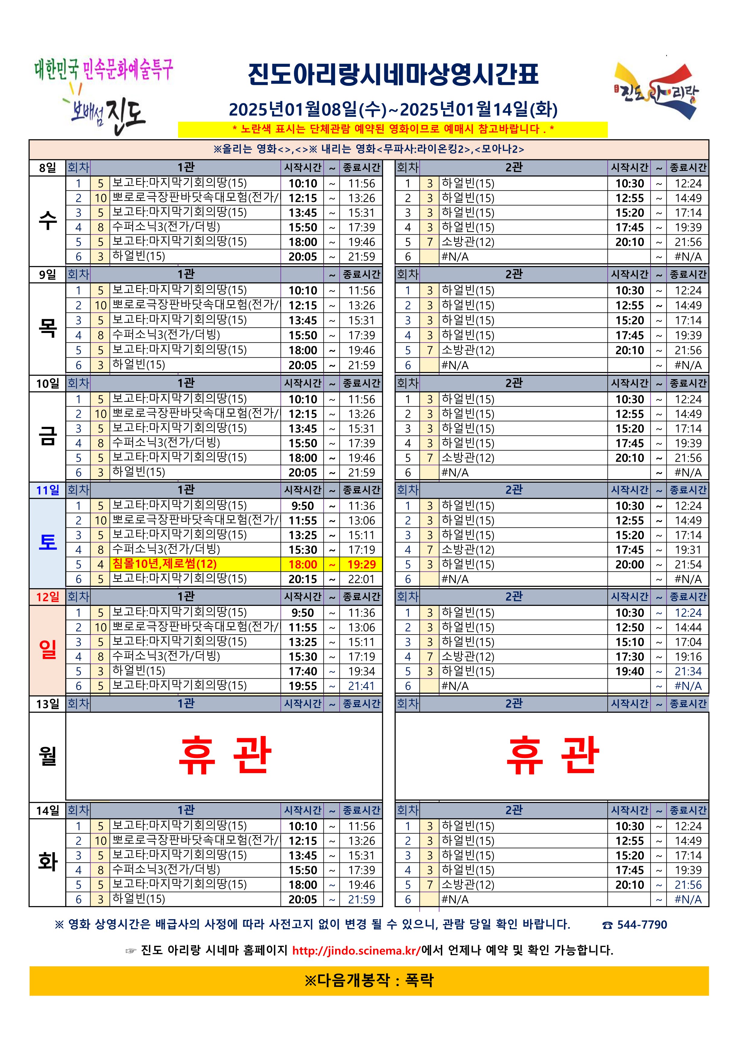 진도아리랑시네마 상영스케줄<(2025.01.08(수)~01.14(화)>안내드립니다.