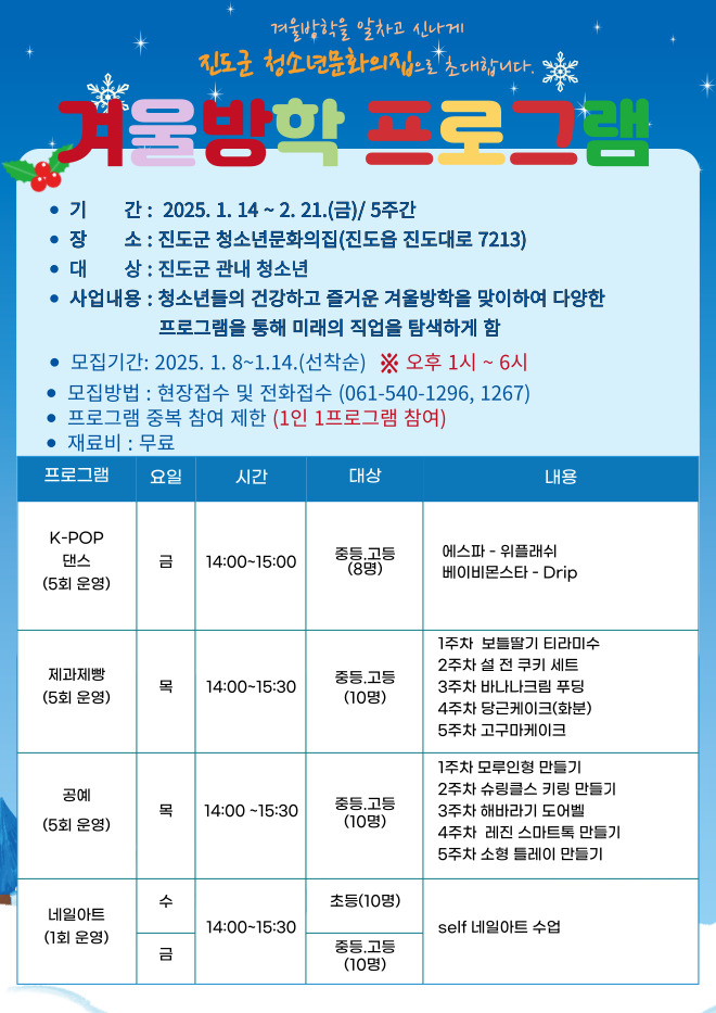 진도군 청소년문화의집 겨울방학 프로그램 운영 안내