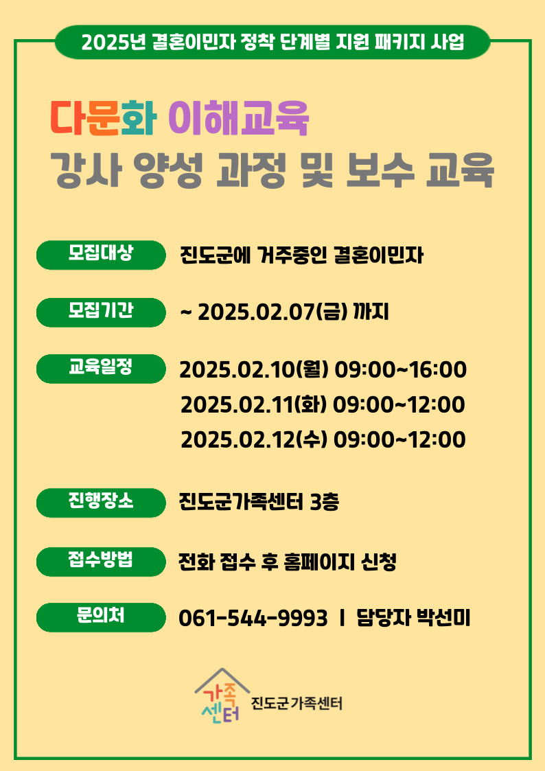 진도군가족센터에서 다문화이해교육 강사 양성 과정 및 보수교육에 참여할 교육생을 추가 모집중에 있습니다.