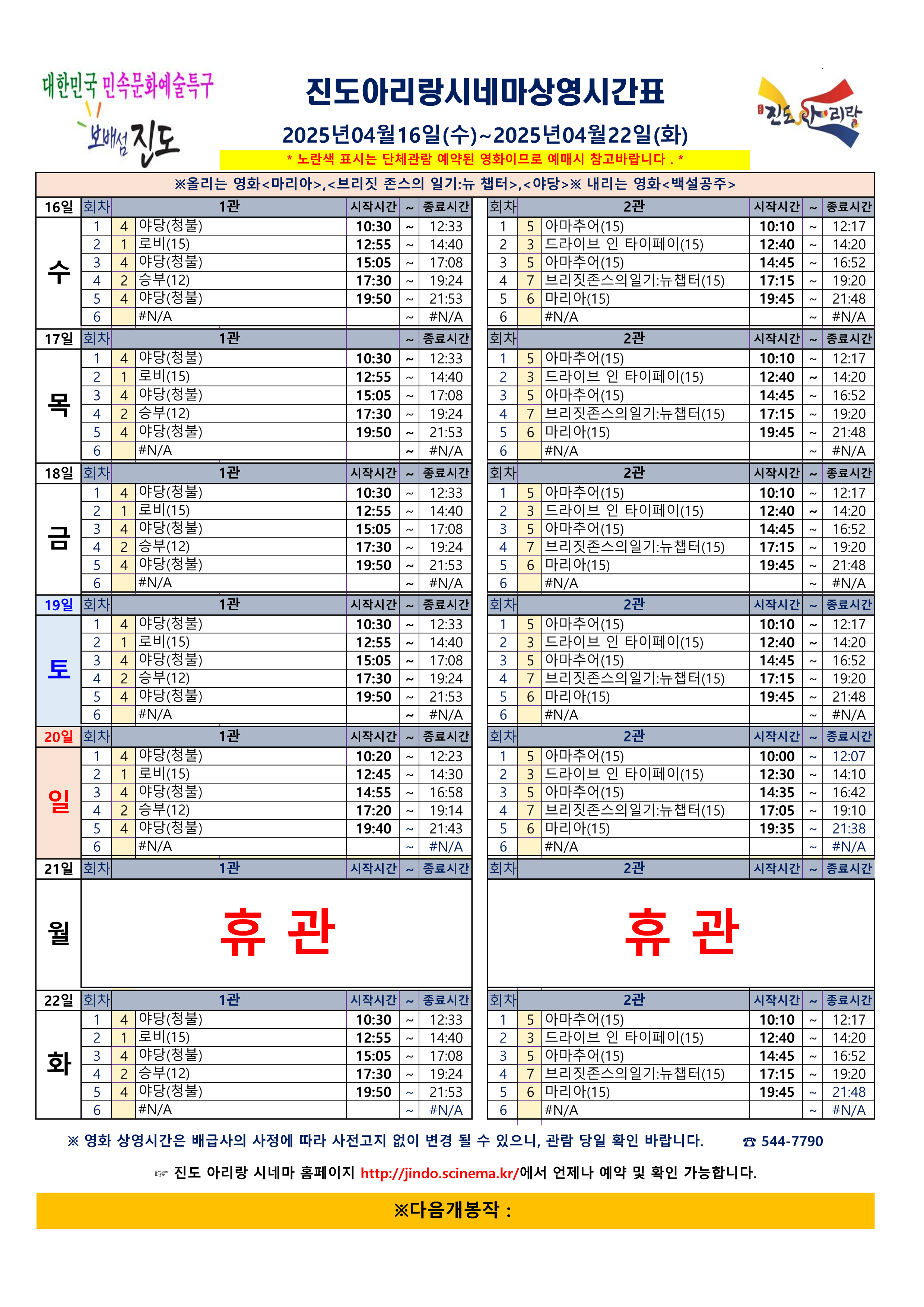 진도 아리랑 시네마 상영시간표 <2025.04.16 (수) ~ 04.22(화)> 안내드립니다.