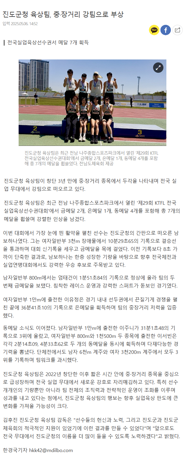 진도군청 육상팀, 중·장거리 강팀으로 부상