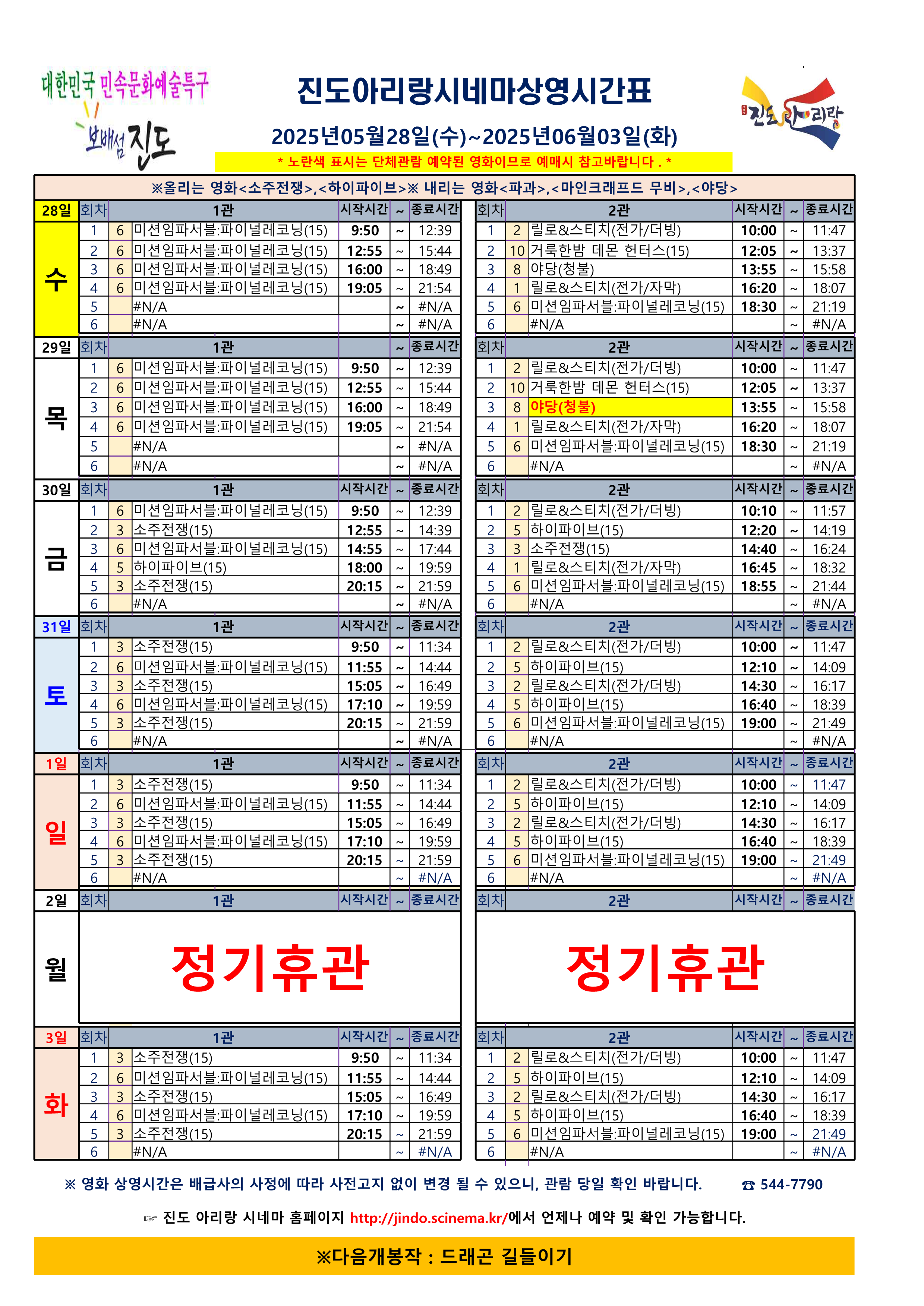 진도아리랑시네마 상영시간표<2025.05.28(수)~06.03(화)> 안내드립니다.