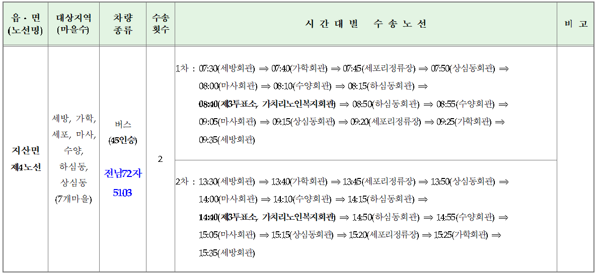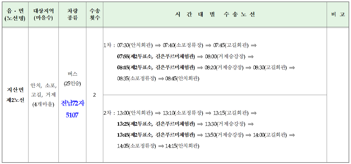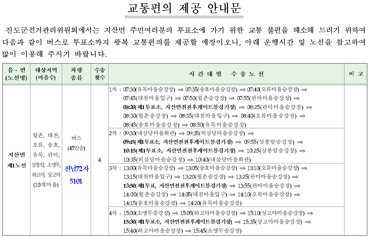 2025. 6. 3. 실시하는 제21대 대통령선거에 있어 교통불편지역 선거인에 대한 교통편의 제공을 다음과 같이 안내합니다. o 운행시간 : 2025. 6. 3.(화) 07:30 ~ 17: 20 o 운행노선 : 4개 노선