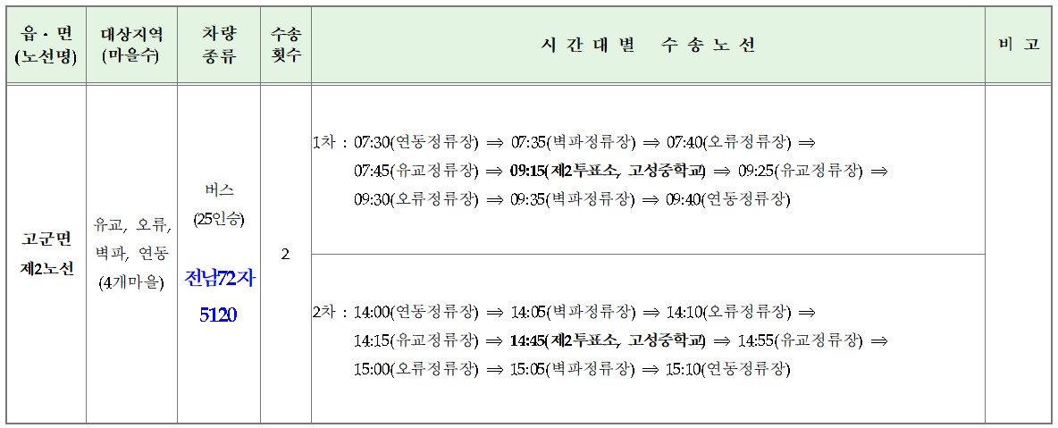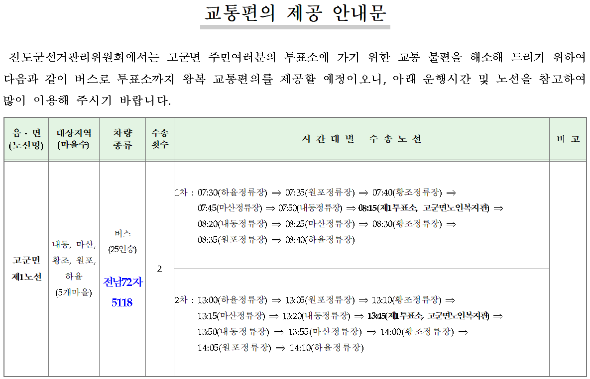 2025. 6. 3. 실시하는 제21대 대통령선거에 있어 교통불편지역 선거인에 대한 교통편의 제공을 다음과 같이 안내합니다. o 운행시간 : 2025. 6. 3.(화) 07:30 ~ 17: 20 o 운행노선 : 2개 노선