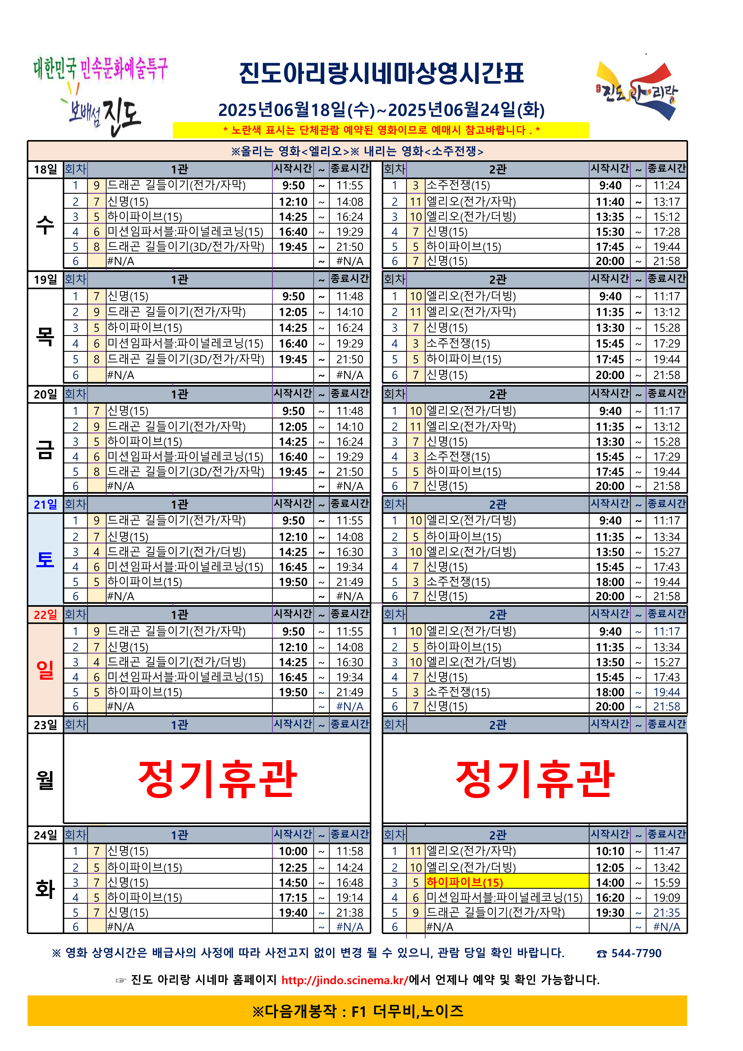 진도아리랑 시네마 상영시간표 <2025.06.18 (수) ~ 06.24(화)> 안내드립니다.
