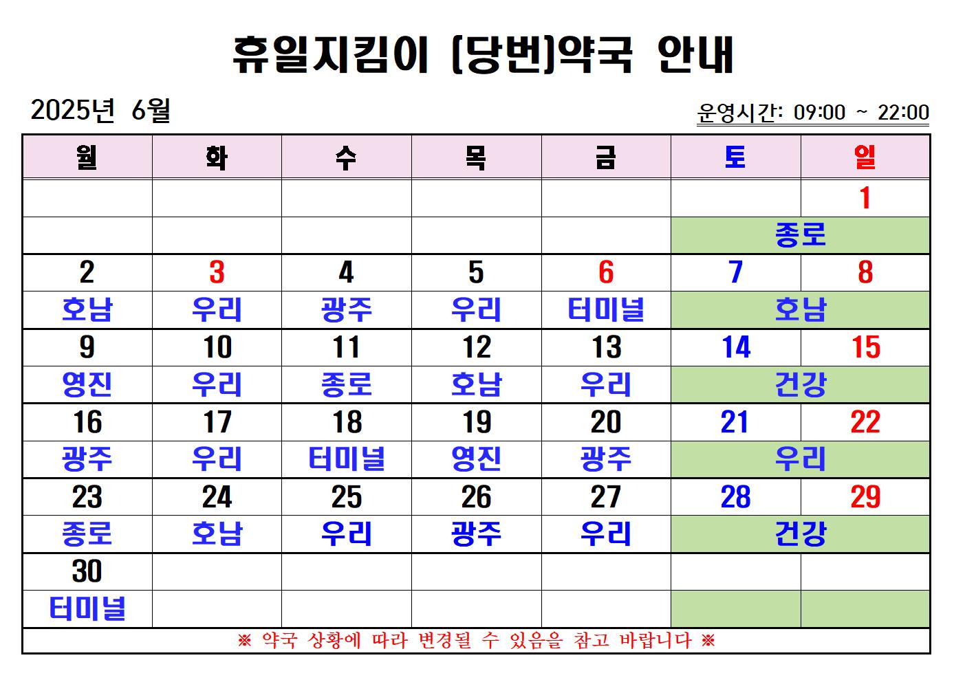 2025년 6월 휴일지킴이 약국 운영 일정 변경되었습니다. 6/20(금) : 우리약국 -> 광주약국 6/21 - 22(토,일) : 광주약국 -> 우리약국