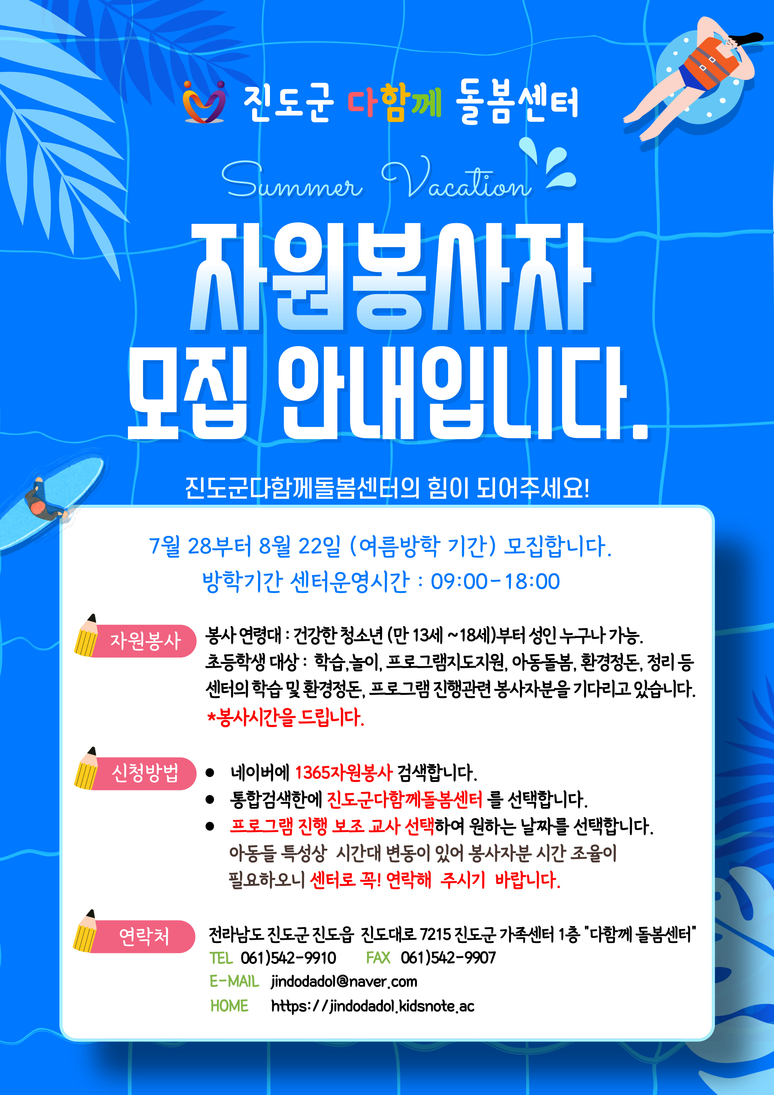 진도군다함께돌봄센터 ♥방학기간 자원봉사자님♥을 기다리고 있습니다. 아래 내용을 확인해 주세요.