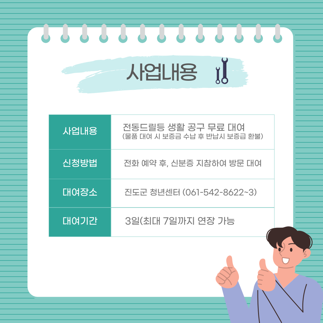 사업내용 : 생활공구 무료 대여 [물품 대여 시 보증금 수납 후 반납 시 보증금 환불(공구별 각 만원)]