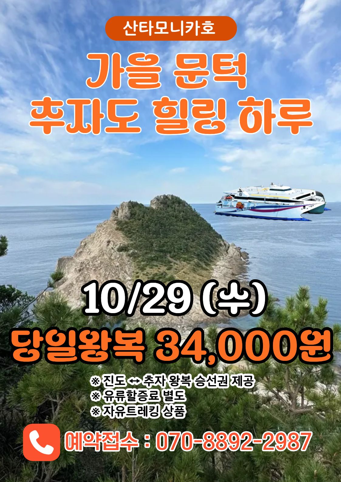산타모니카호 가을 문턱, 추자도 힐링 하루 여행 오는 10월 29일(수), 진도 ↔ 추자 당일왕복 승선권 단 34,000원! 제공: 진도 ↔ 추자 왕복 승선권 별도: 유류할증료 자유 트레킹 상품 (당일 여행 가능) 예약문의: 070-8892-2987