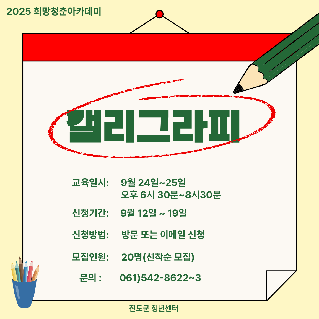 청년들의 활발한 취미활동 유도와 역량 강화를 위해「2025년 희망청춘 아카데미」4~5회차 수강생을 모집하니, 많은 신청 바랍니다.