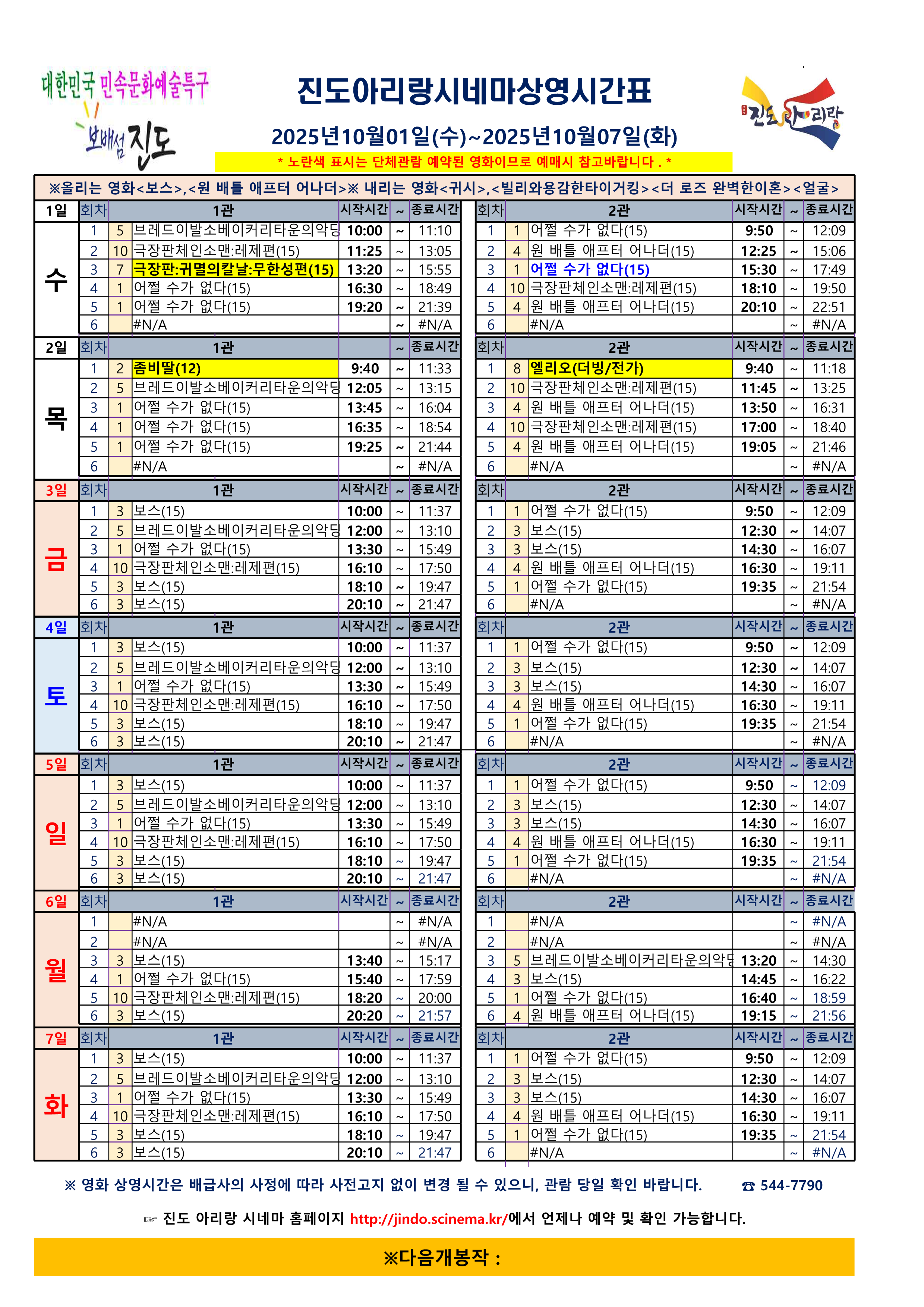진도아리랑 시네마 상영시간표 <2025.10.01일(수) ~ 10.07(화)> 안내드립니다.