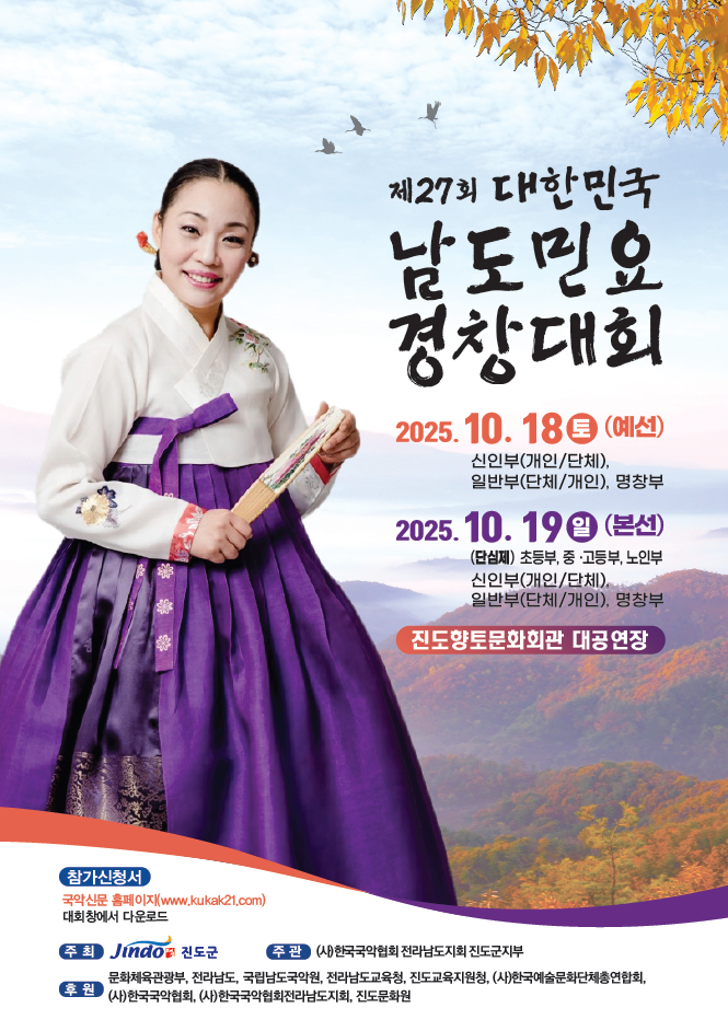 제27회 대한민국 남도민요경창대회를 아래와 같이 개최하오니 관심있는 분께서는 많은 홍보 및 관람 부탁드리겠습니다!!! 문의사항은 진도국악협회(061-544-0588)로 연락주세요~
