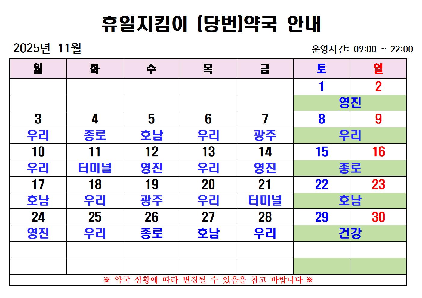 2025년 11월 휴일지킴이(당번)약국 운영 일정 안내