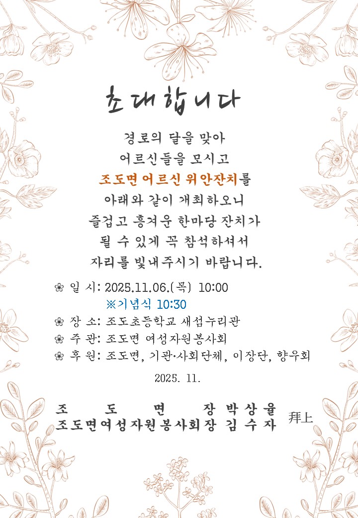 2025년 조도면 어르신 위안잔치 안내(2025. 11. 06. (목) 기념식 10:30 / 조도초 새섬누리관)