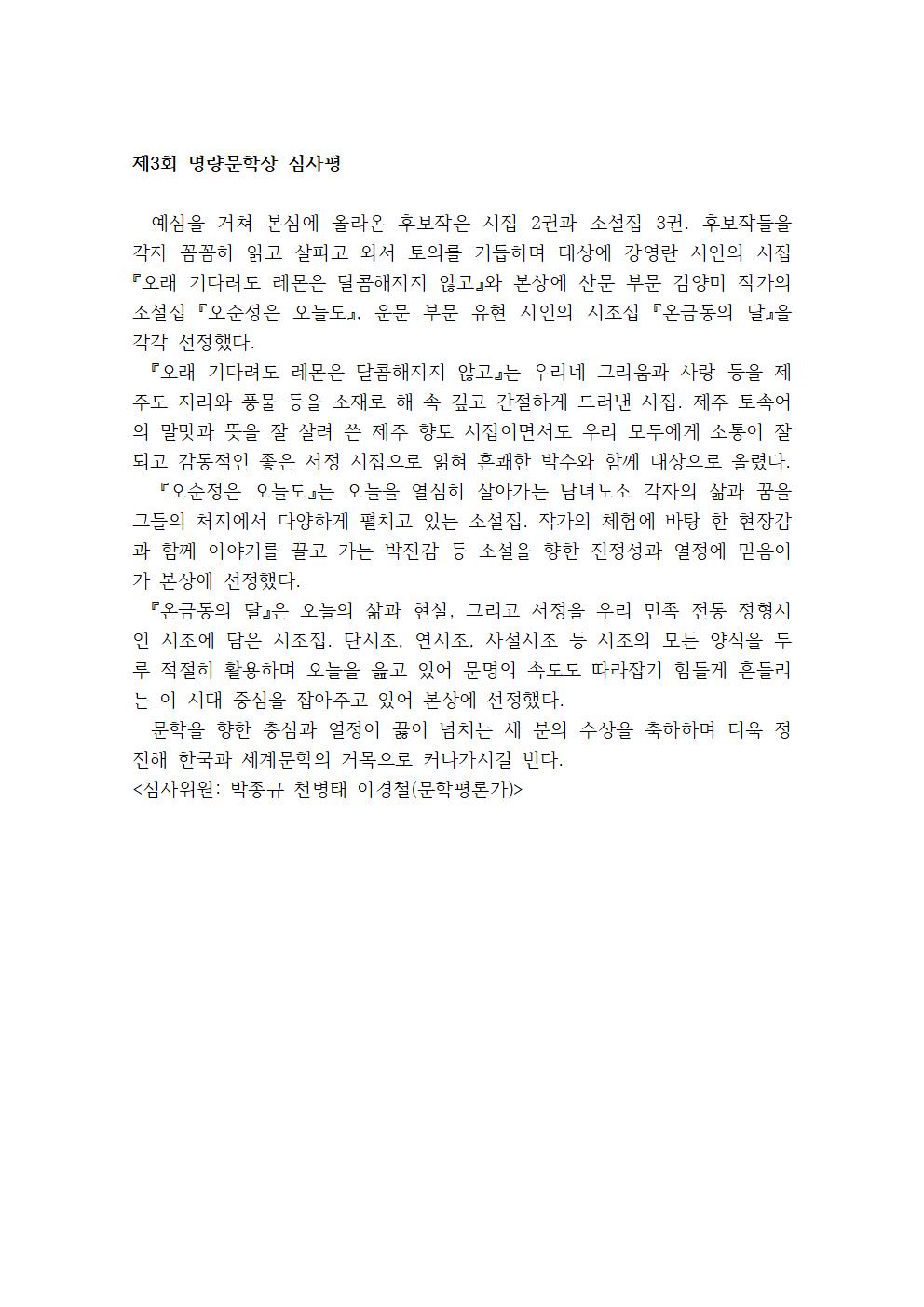 제목 축)제3회 명량문학상 수상자 발표 -명량문학상추진위원회