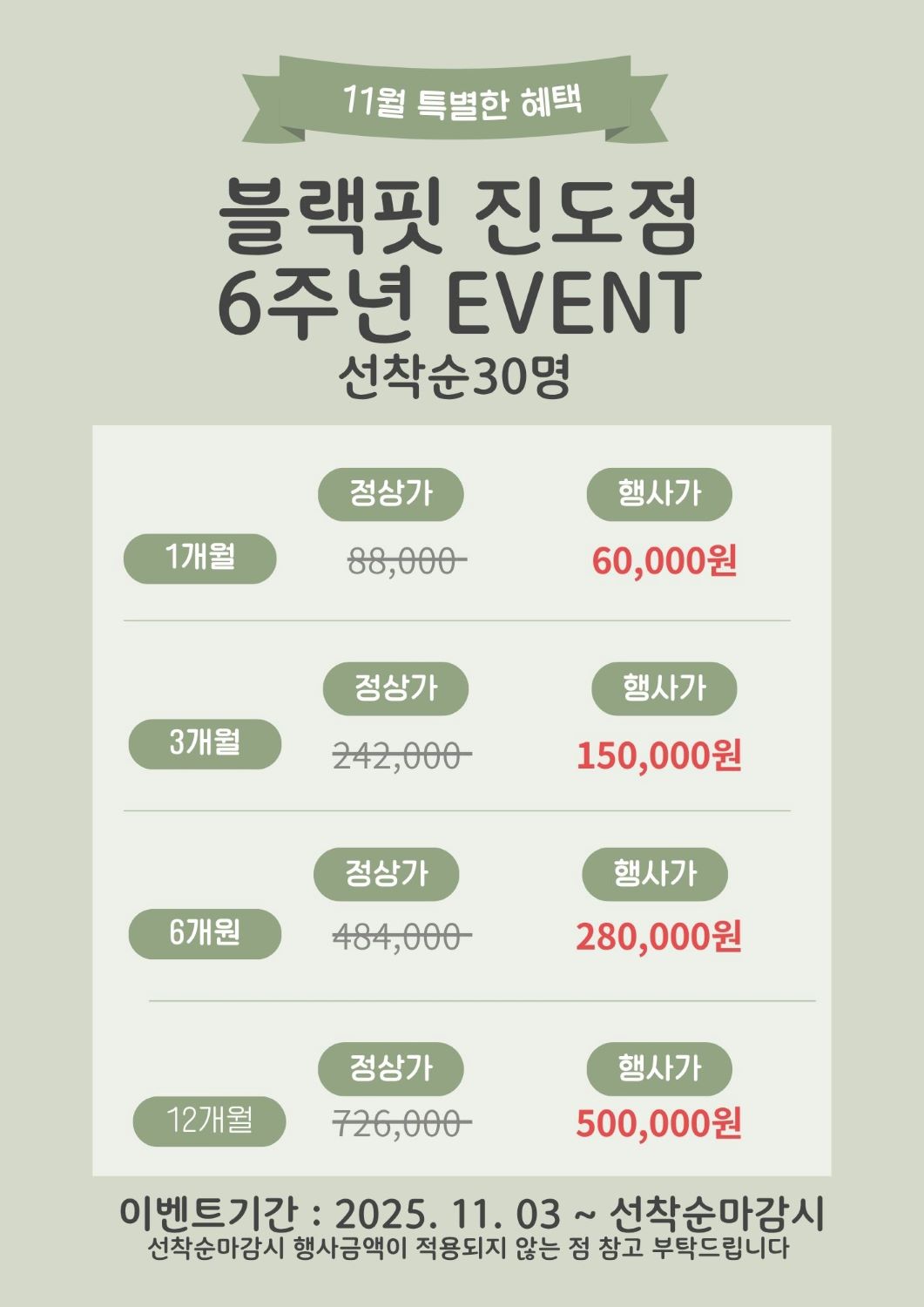 드뎌 9시 11/3(월) 9시 등록 선착순 행사가 오픈했어요 오픈 전부터 미리 와서 대기해주신 회원님들 넘 감사드리고 전화로 신청이 힘드니 센터방문 등록 부탁드립니다~ 오늘 중으로 마감될 예정이니 서둘러 주세요^^ -블랙핏 진도점 이사벨 올림-