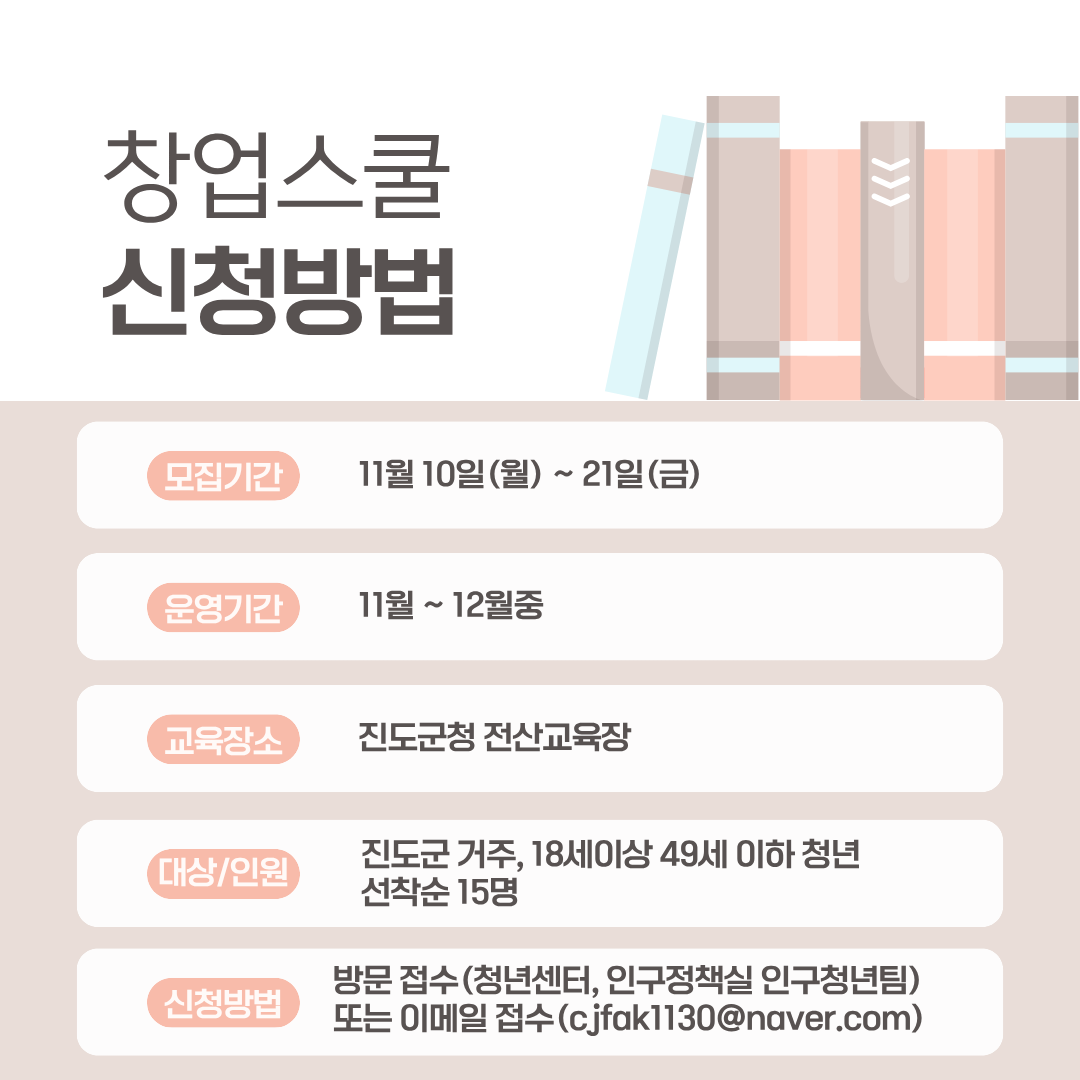 취.창업에 도움이 되는 자격증 교육과정 운영을 통해 관내 청년층의 취업 경쟁력을 향상시키기 위하여 「2025년 진도군 청년 창업스쿨」 수강생을 모집합니다