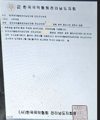 위 두 사진은 (사) 한국국악협회 전라남도 지회와 진도군 지부가 2024년 1월 2일과 2024년 2월 5일 (사) 한국국악협회 전라남도 지회 진도군 지부 ㅇㅇㅇ회원의 광주 절도사건(202*.00.00.)에 대한 조사요청(3회)이 들어와 서로 주고받은 경위서 공문이다.