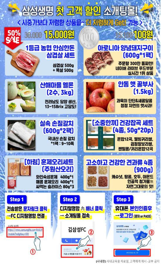 삼성생명이 일부 부담하는 소개팅몰 소개합니다. 삼성생명 첫 고객 할인 소개팅몰! 시중가보다 저렴한 상품을~ 더 저렴하게 Get!가능 https://mws.samsunglife.com:8440/#/mobile?mdigitkey=0002233133