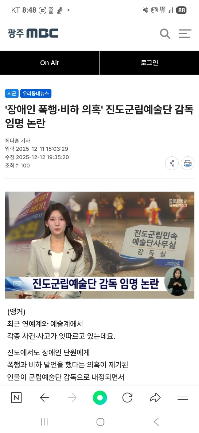 * 군 : 군민들의 소중한 혈세로 운영되는 예술단의 수장될 자가, 장애인 폭행 및 비하 발언도 모자라 공금횡령 의혹까지 있는 자라니, 오호통재라~