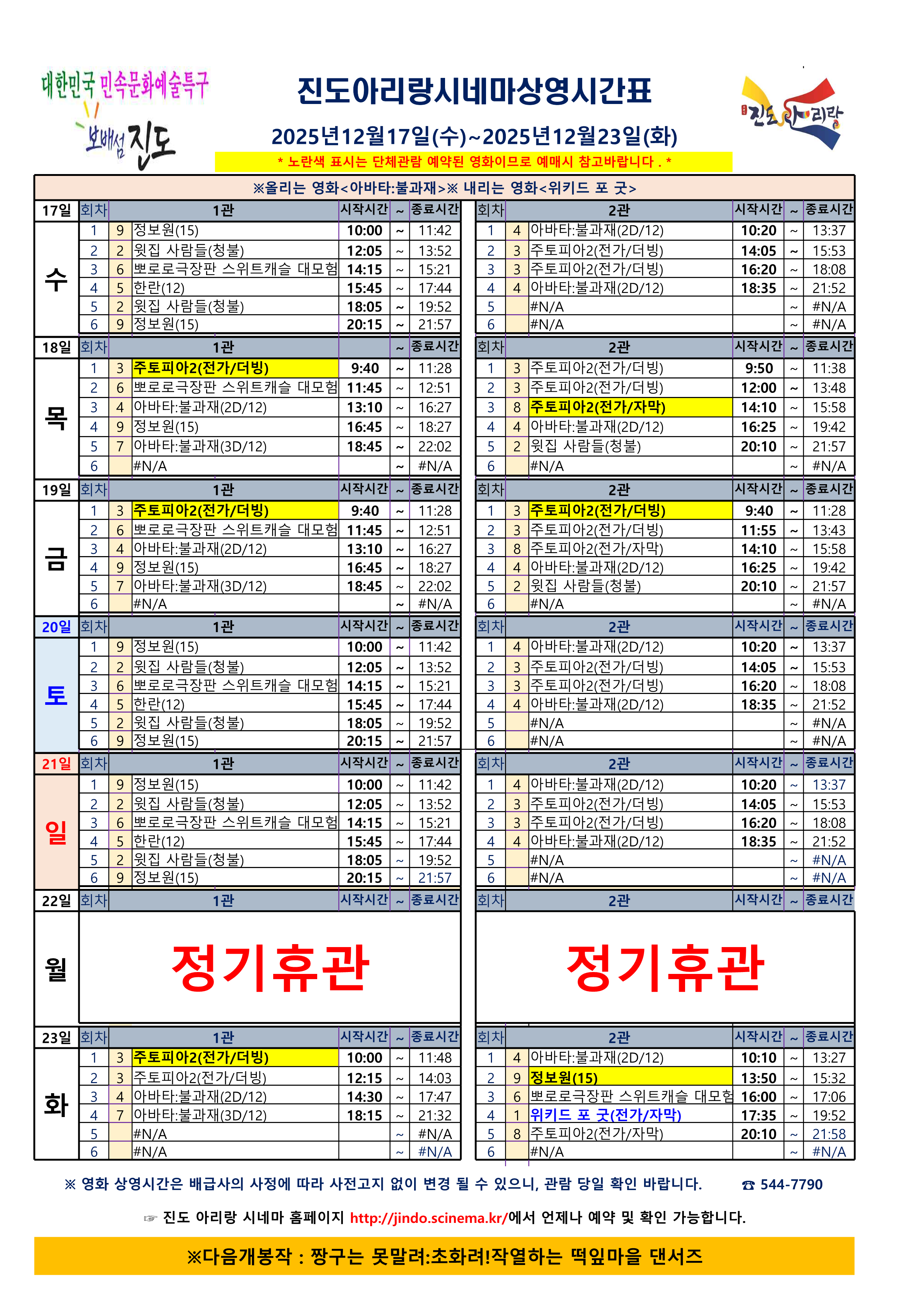 진도아리랑시네마 상영시간표 <2025.12.17(수) ~ 12.23(화)> 안내드립니다.