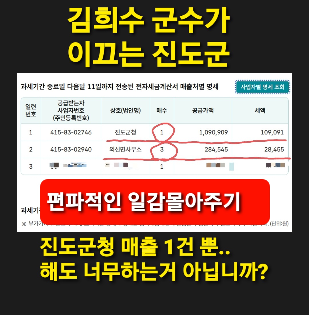2025년 하반기 부가가치세 신고하려고 보니 진도군청 상대 매출이 1건 뿐.. 군수 당선되고