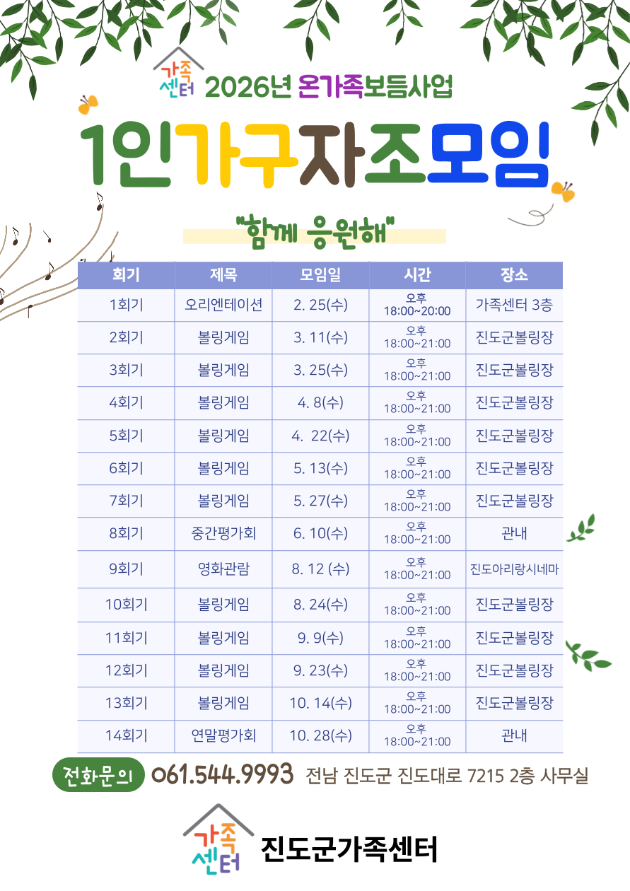 신청방법: 진도군가족센터 홈페이지 방문하여 회원가입 후 '2026년 1인가구 자조모임' 프로그램 신청