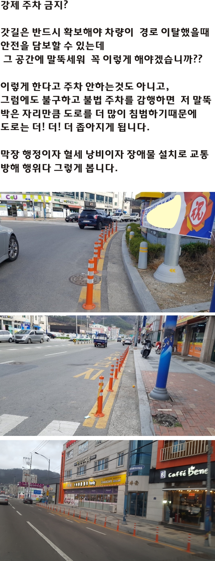 이런거 설치할 시간에 단속을 강화해서 과태료를 받으면 불법 주차도 막고, 세수도 확보하고 1석 2조.