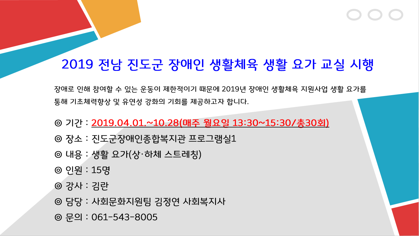 [진도군장애인종합복지관] 2019 전남 진도군 장애인 생활체육 생활 요가 교실 시행