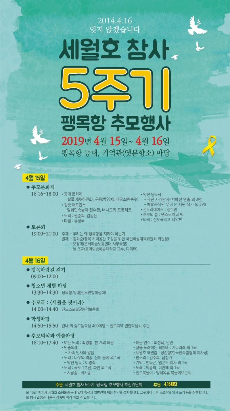 세월호 참사 5주기를 맞아 4.16재단의 후원으로 민간시민사회단체 주관 추모행사를 개최하게 되었습니다. 세월호 참사의 희생자를 기리고 기억하며, 진상규명을 통한 보다 안전한 사회로 나아가기 위한 작은 발걸음 함께 걸어갈 수 있기를 바랍니다.
