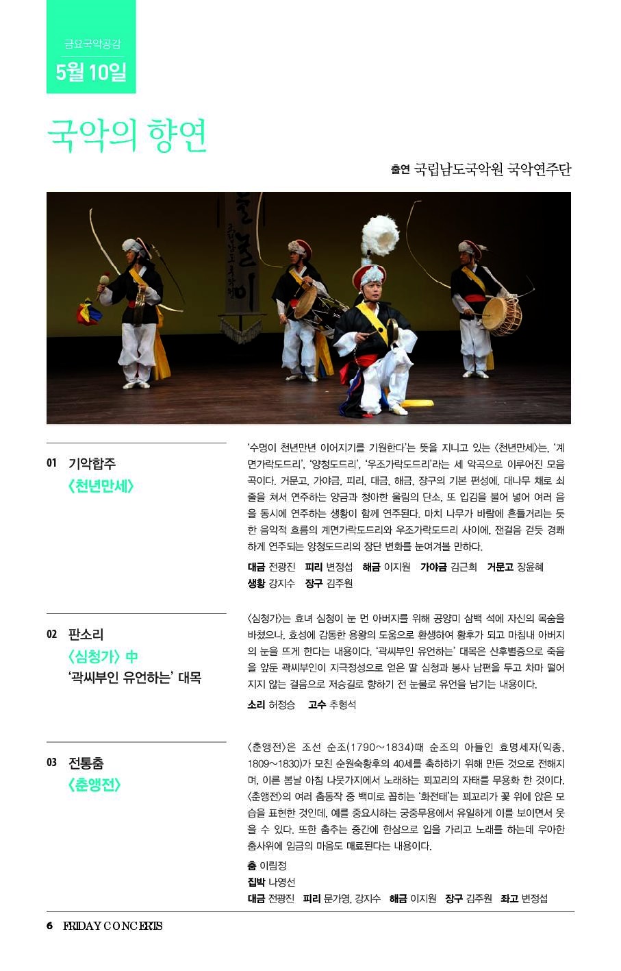 5월 10일 금요국악공감은 국립남도국악원 국악연주단의 "국악의 향연"입니다.