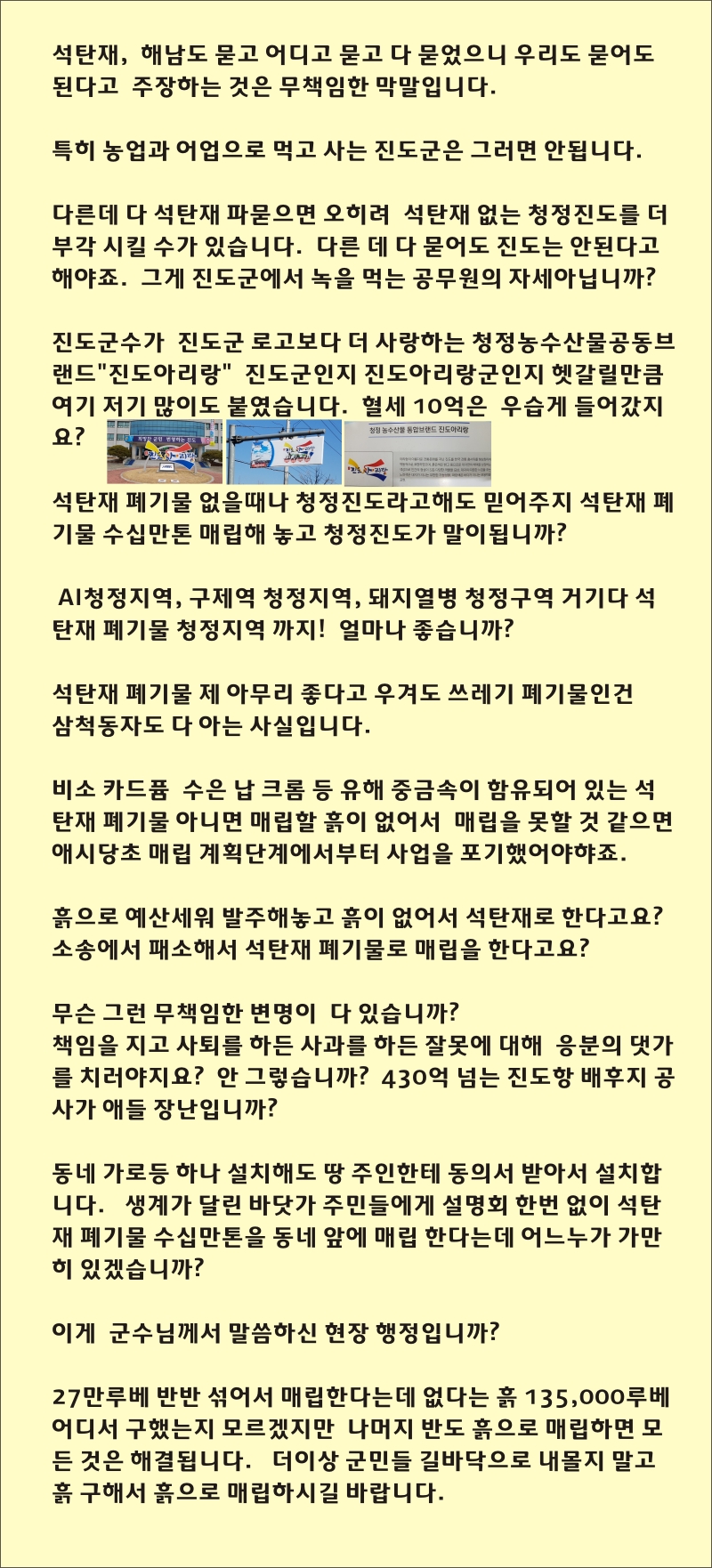 석탄재 폐기물 매립지 수산물 드시겠습니까? 아니면 반대 운동 하시겠습니까?