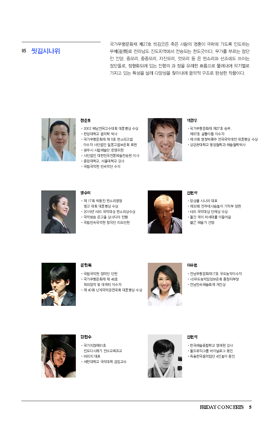 '앉은반 설장구'부터 고수가 중심이 되는 '판소리와 고법', '승무', '벅구춤', '씻김시나위'까지