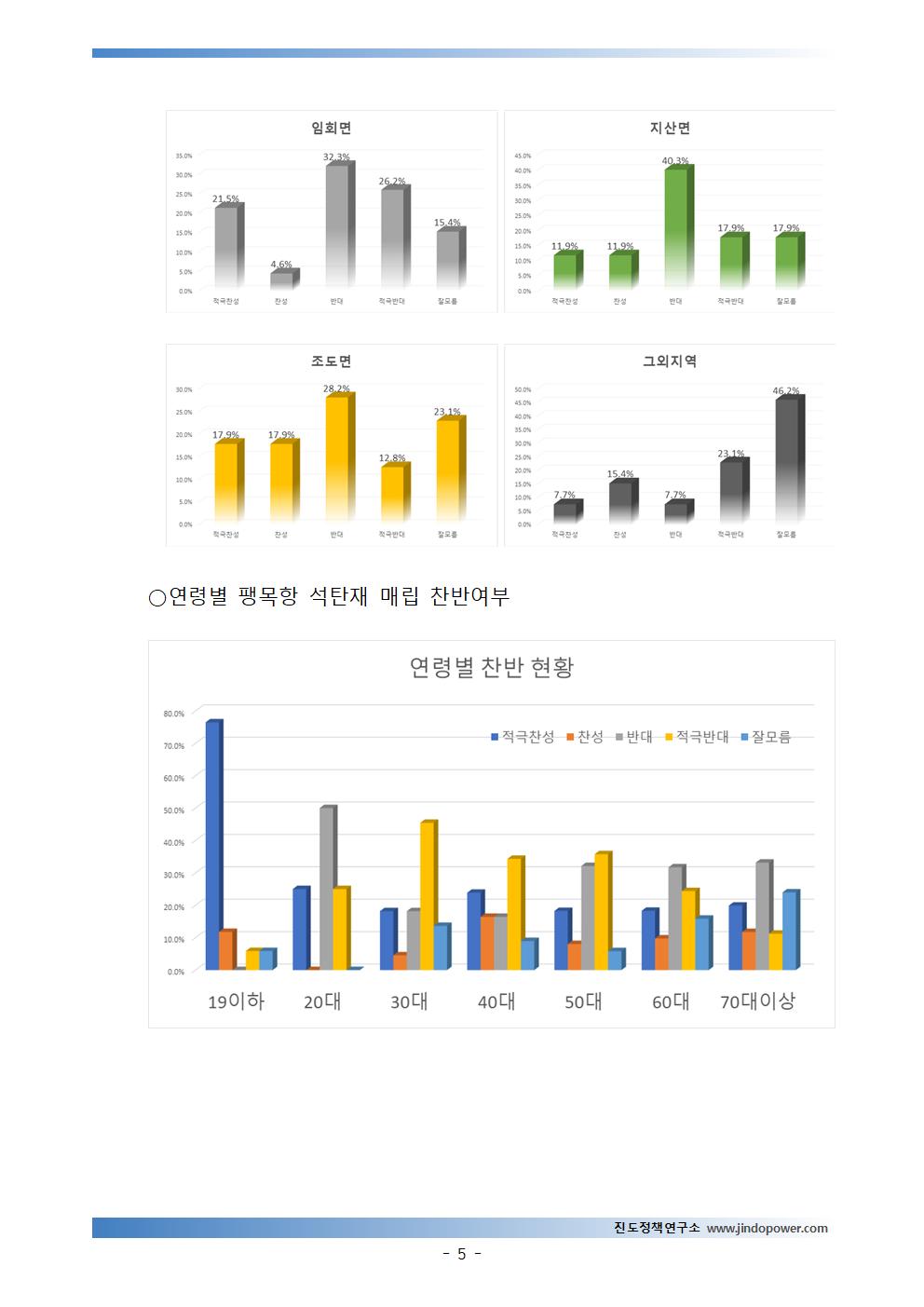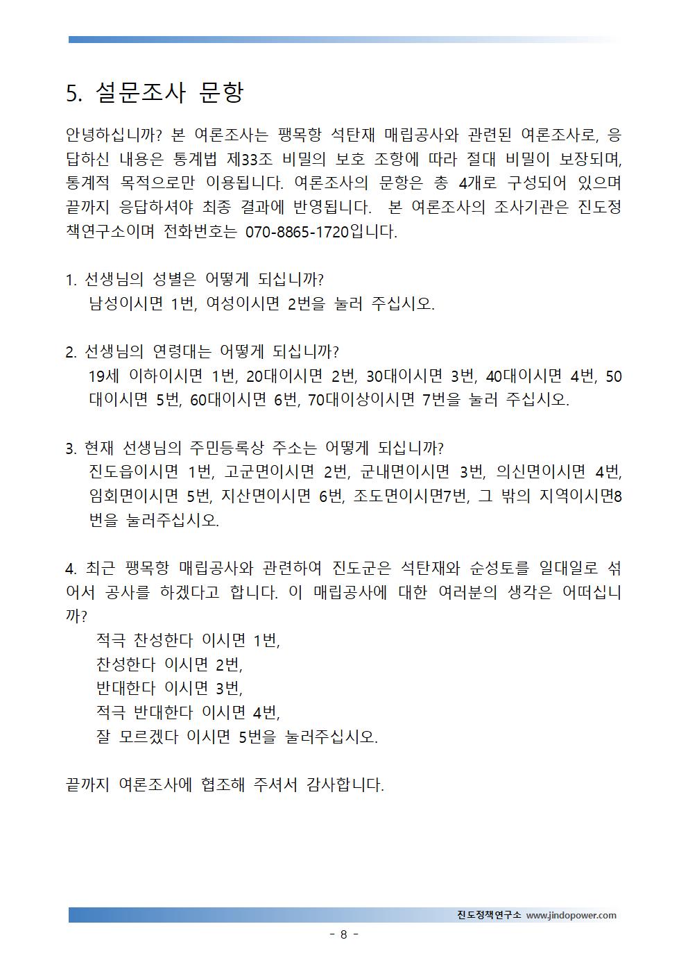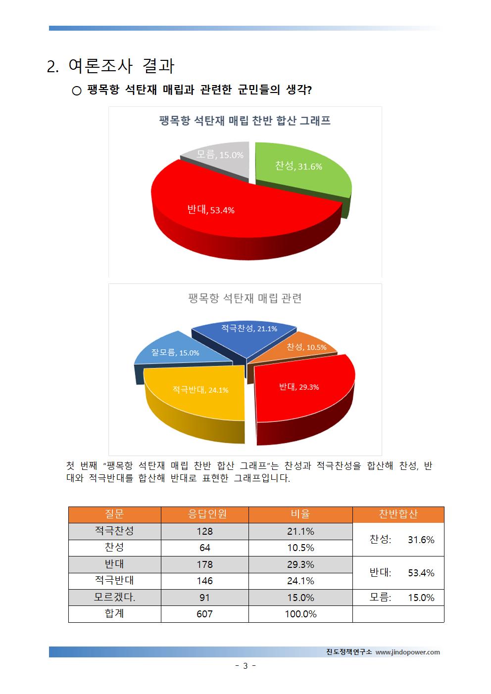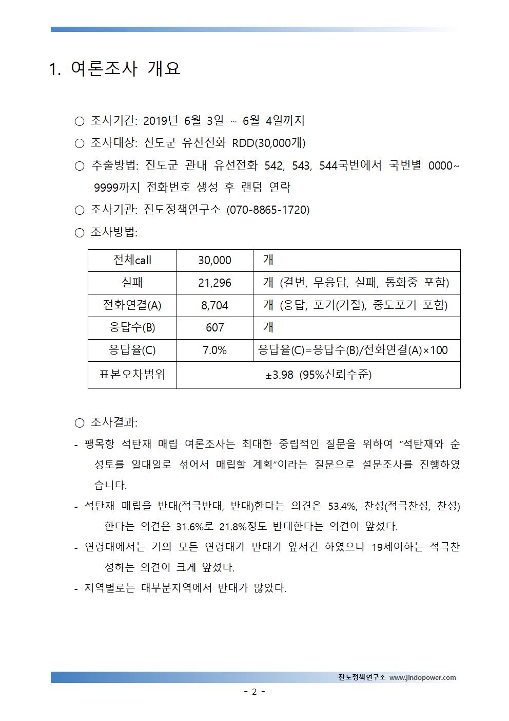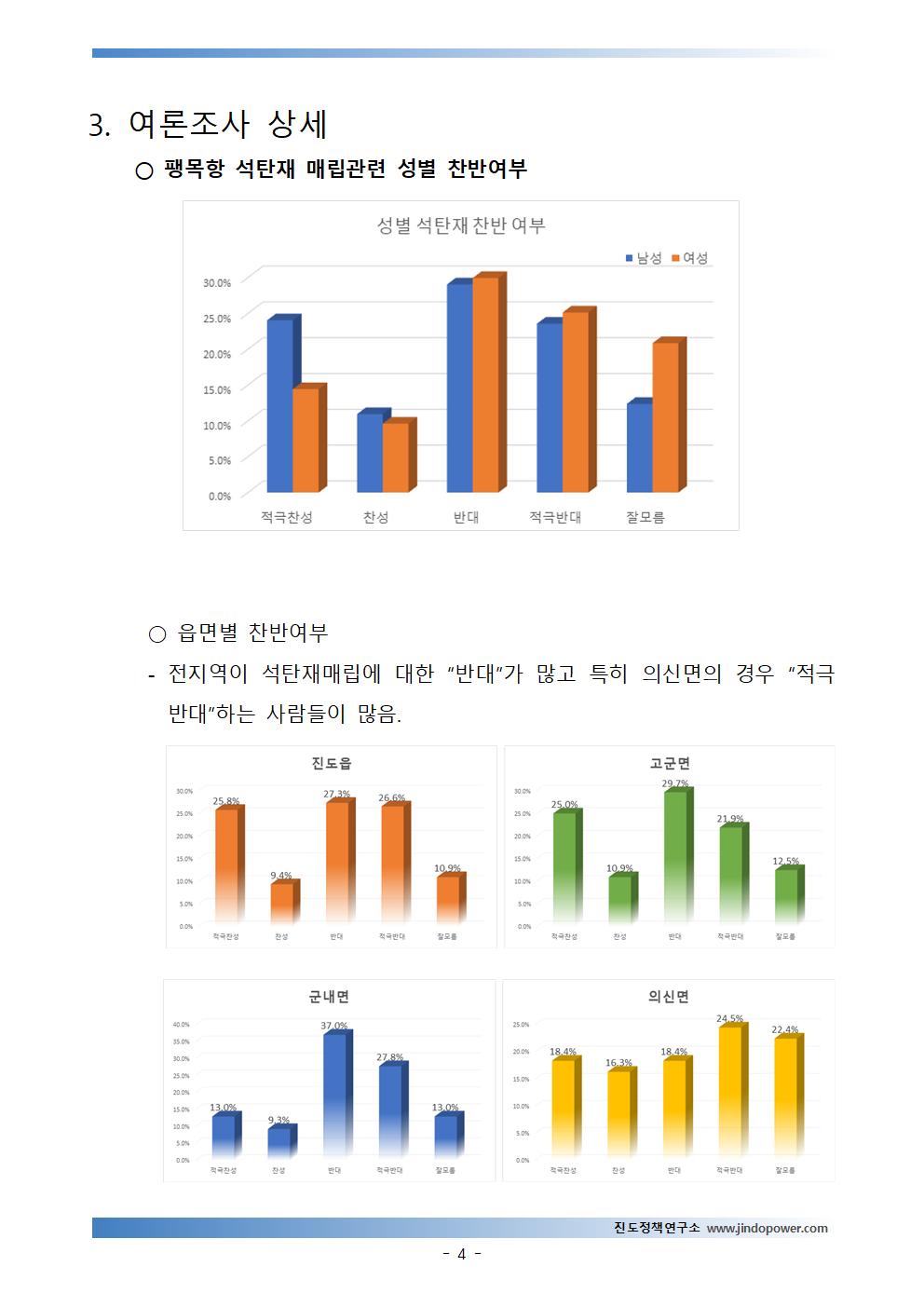 진도정책연구소(http://www.jindopower.com)에서 6월3일과 4일 진도군민을 대상으로 여론조사를 하였는데 그 결과를 보더라도 대다수의 군민들이 반대하고 있다면 진도군의 입장 변화도 필요한것 아닌가 한다.