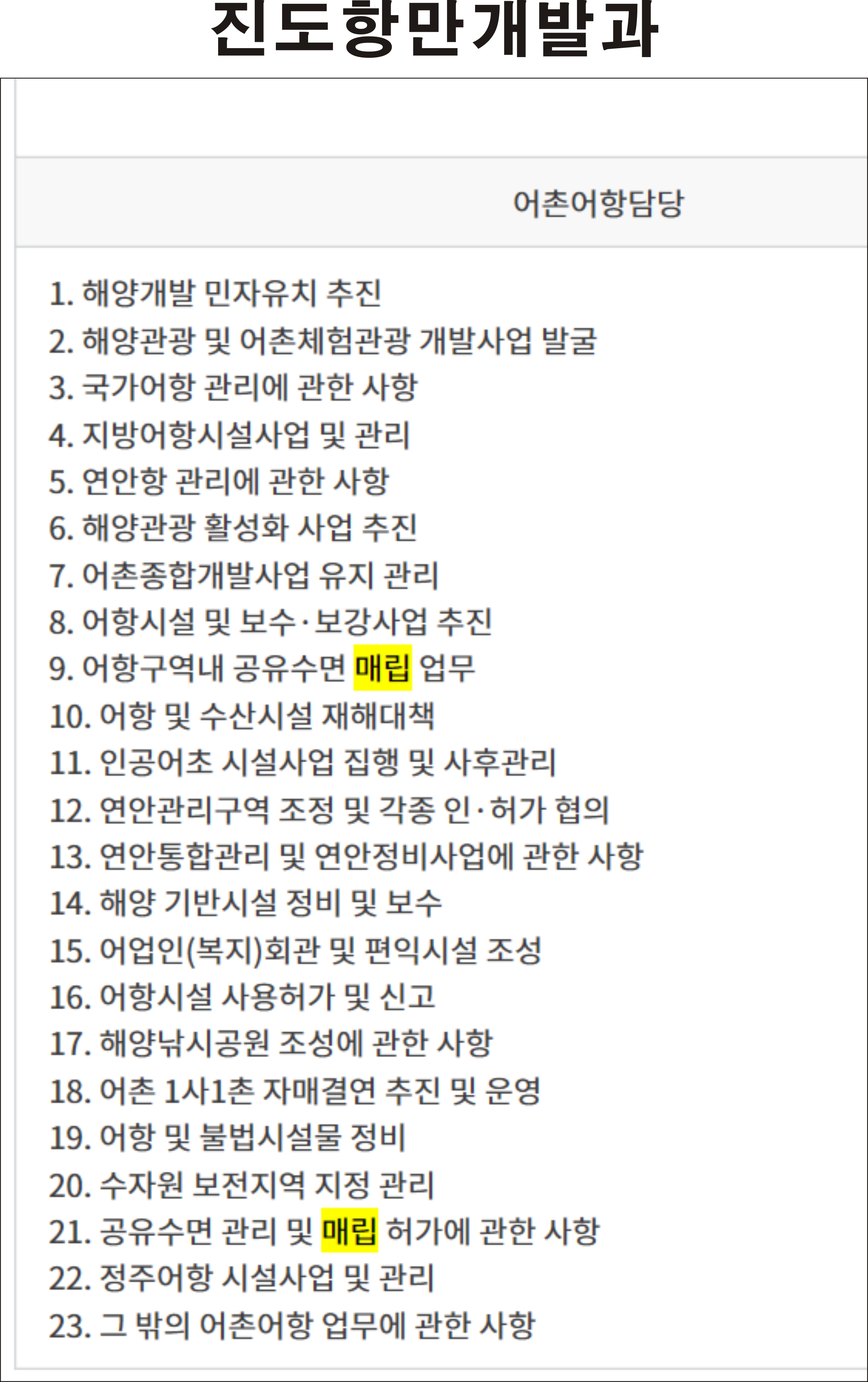 진도항 항만개발과에는  공유수면 매립을 담당하는 업무 분장이 명백히 존재합니다.