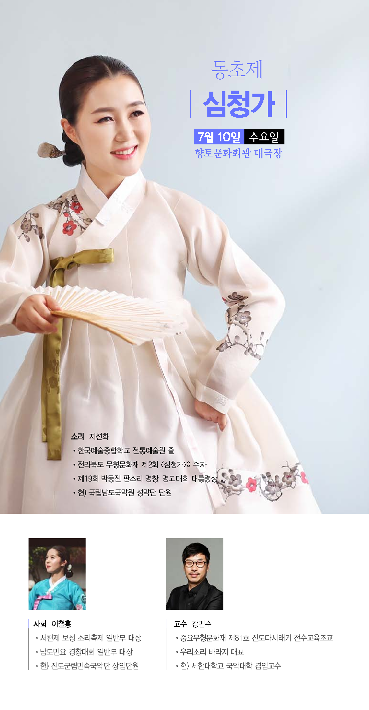 7월 10일(수) 두 번째 <판소리 클래식>은 타고난 목구성이 좋아 막힘 없는 소리를 구사하는 지선화의 "심청가"입니다.