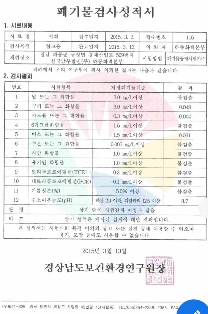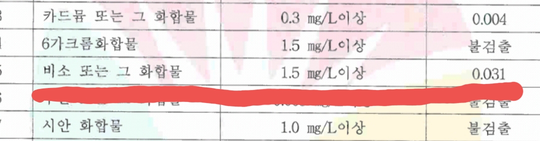 석탄재 중금속 용출실험을 통해서도 비소가 WTO권장 수치 3배를 초과합니다.