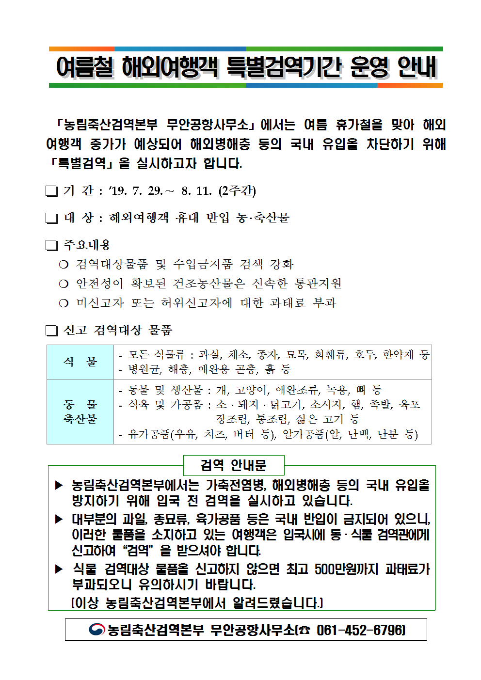 2019년 여름철 해외여행객 휴대 동식물 특별검역기간 운영 알림