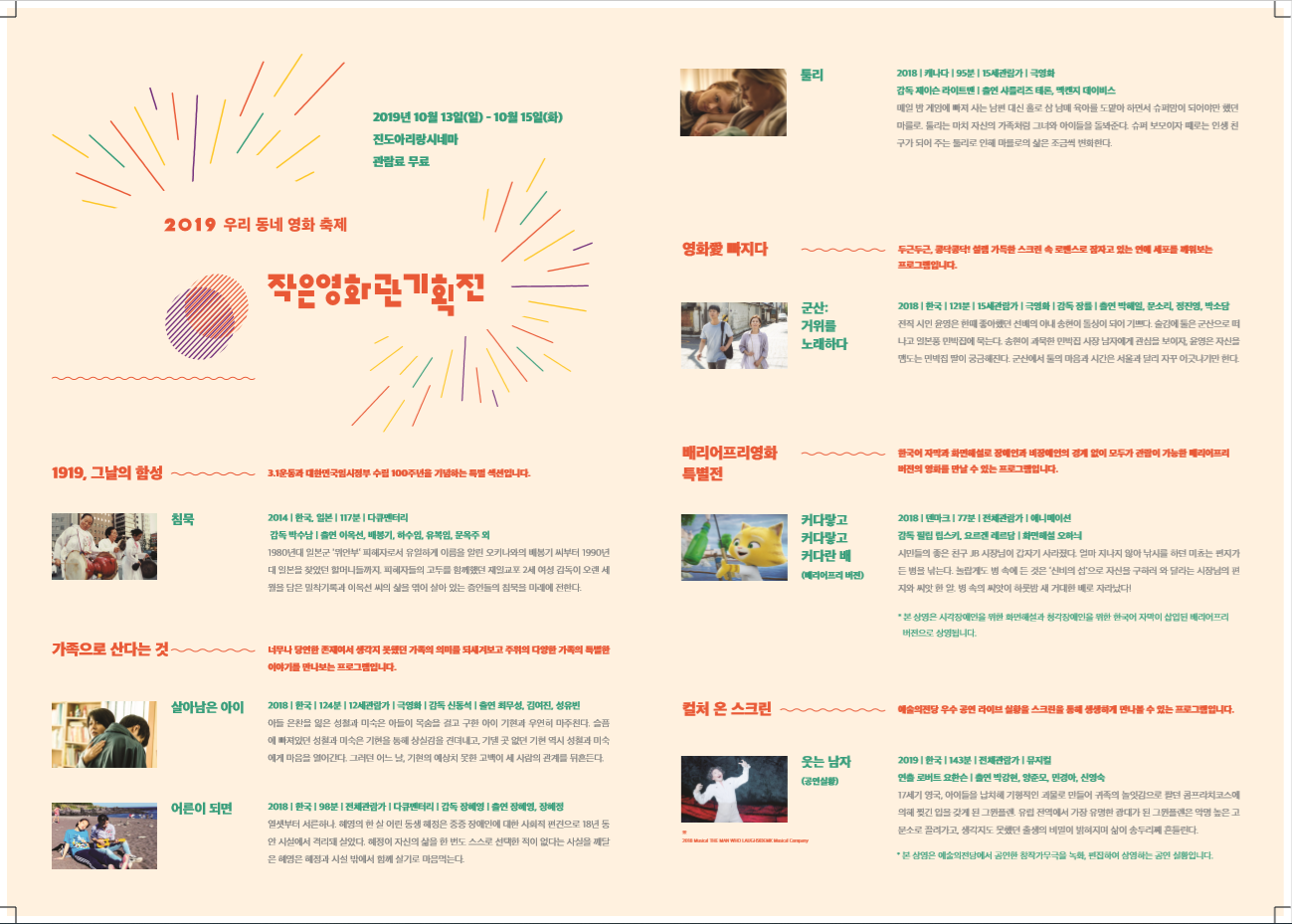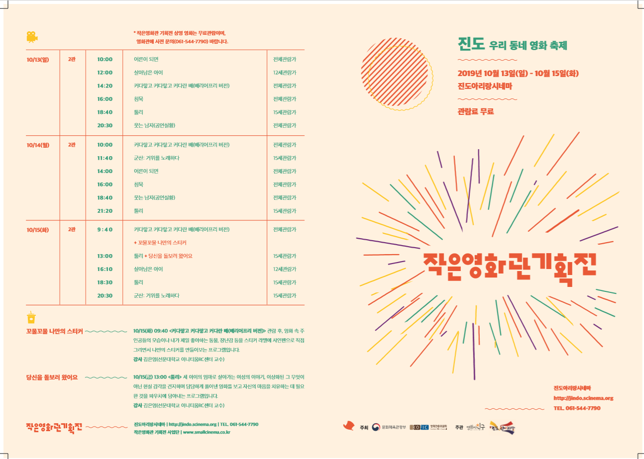 제목 진도 아리랑 시네마에서 10월 13일~15일 작은영화관 기획전을 무료로 상영합니다~