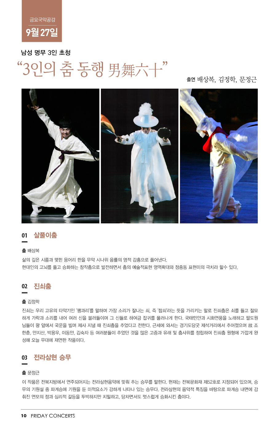 9월 27일 금요국악공감은 배상복, 김정학, 문정근 남성 명무 3인이 펼치는 "3인의 춤 동행 男舞六十"입니다.