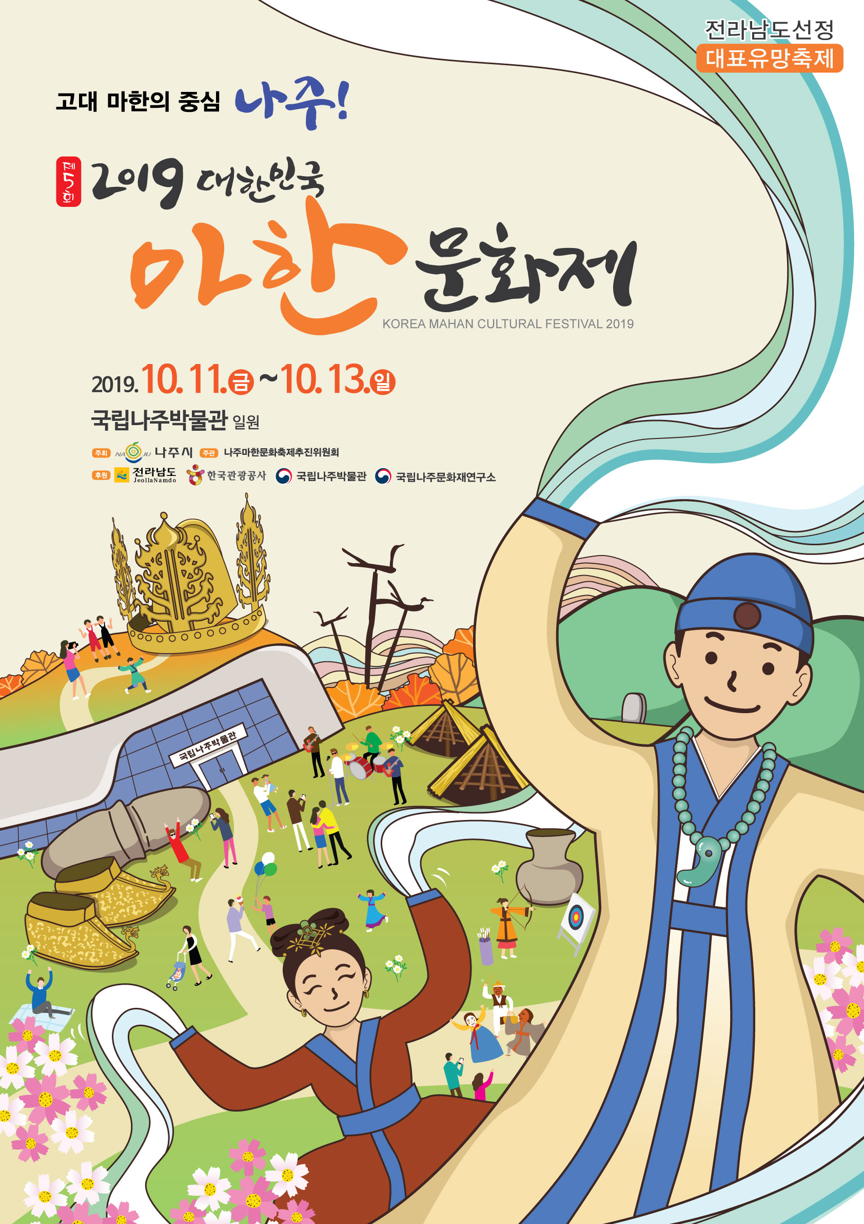 제5회 2019 대한민국 마한문화축제가 10월 11일(금) ~ 13일(일) 3일간 국립나주박물관(전남 나주시 반남면 고분로 747) 일원에서 개최됩니다.